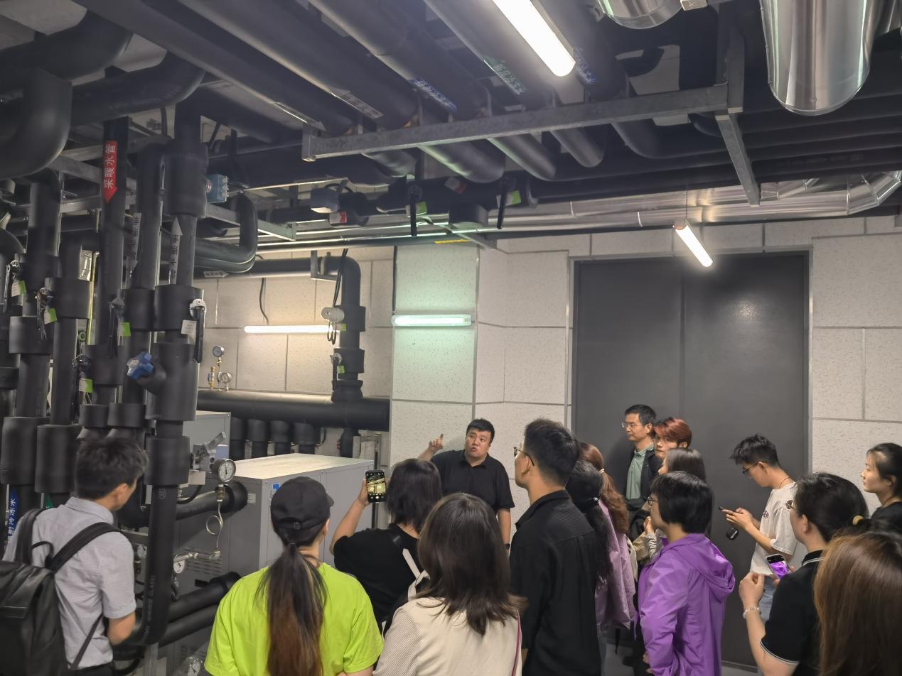 在现场参观的过程中,师生就一体化建筑设计方法,从建筑方案出发控制建筑负荷,通过暖通空调系统与高效照明系统的设计优化,提高系统综合效率与可再生能源利用等问题与技术人员开展交流。同学们结合各自的科研课题进展情况及今后的深造与就业方向与专业教师们也进行了深入探讨交流。