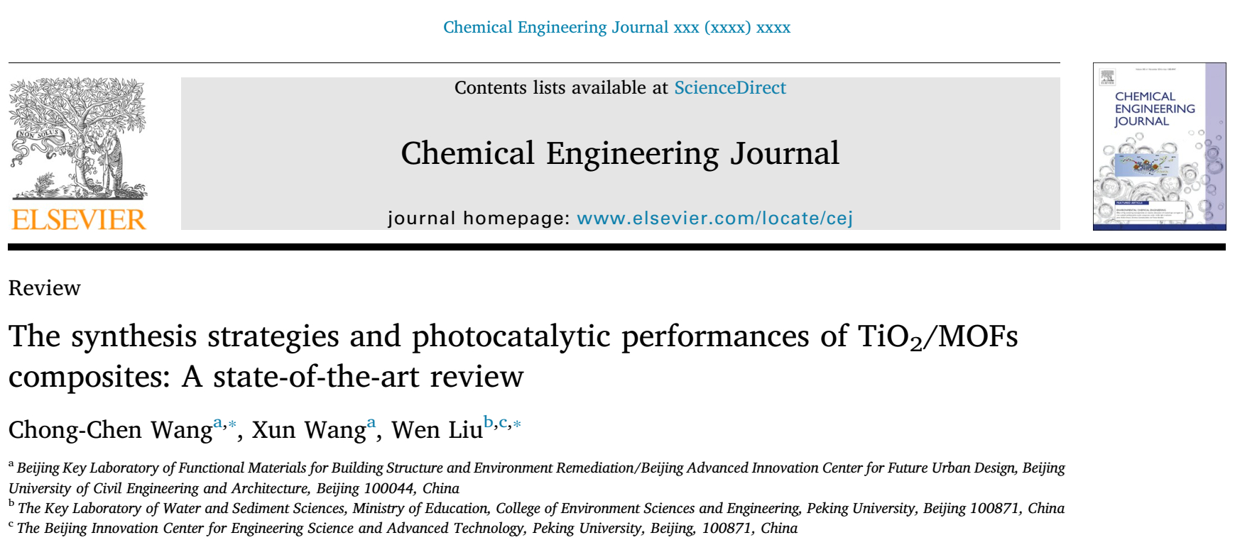 NMter课题组王崇臣教授和北京大学刘文研究员对近年来TiO2/MOFs复合物在光催化领域的研究进展进行了综述,文章在《Chemical Engineering Journal》(SCI索引,中科院一区期刊,影响因子8.355)发表。该论文对TiO2/MOFs复合物的合成策略和光催化应用(还原二氧化碳、光分解水制氢、光催化降解有机污染物及光催化还原Cr(VI)等)进行了总结和讨论。同时,对TiO2/MOFs复合物在光催化领域中的应用前景进行了展望,分析了今后工作中MOFs、TiO2及MOFs/TiO2在光催化领域中所面临的机遇、挑战及相应的解决方案。