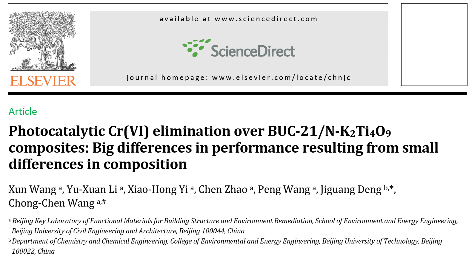 NMTer课题组硕士研究生王恂在《Chinese Journal of Catalysis》(SCI索引,中科院一区,影响因子4.914)上发表论文,对BUC-21/N-K2Ti4O9复合材料高效光催化还原Cr(VI)进行了深入研究。结果表明N-K2Ti4O9的引入不仅可以拓宽BUC-21的响应光区,还可以促进光生电子-空穴的分离,从而提高其对Cr(VI)的还原能力。同时对复合物的循环利用性和稳定性进行了探究,为制备环境友好、性能优异且实际应用潜力较大的MOFs复合物提供了科学依据。