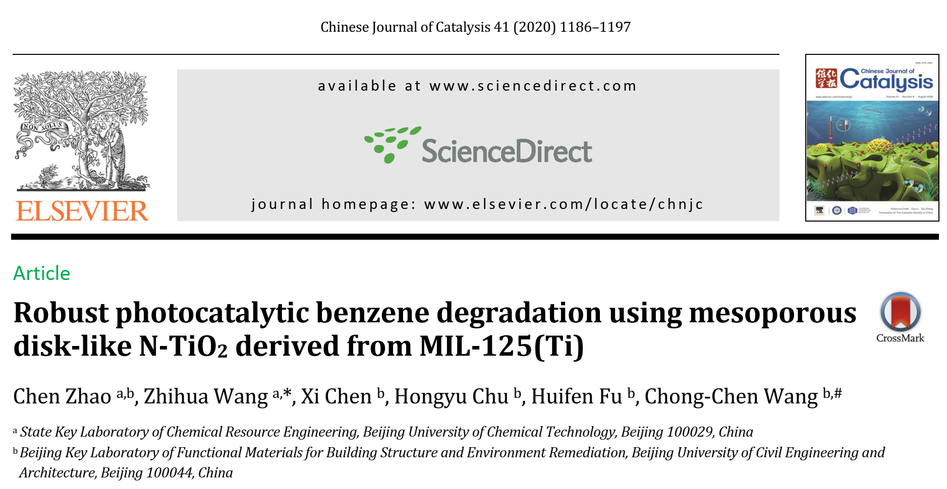 NMTer课题组赵晨老师在《Chinese Journal of Catalysis》(SCI索引,中科院一区期刊,影响因子4.914)上发表论文。采用MIL-125(Ti)作为前驱体,三聚氰胺作为氮源,运用空气氛围下高温煅烧的方法制备了一系列具有可见光光催化活性的圆盘状介孔锐钛矿-金红石混合晶型的N-TiO2。由于该N-TiO2优异的可见光吸收能力和传质能力,其对气态苯表现出优异的光催化降解性能。