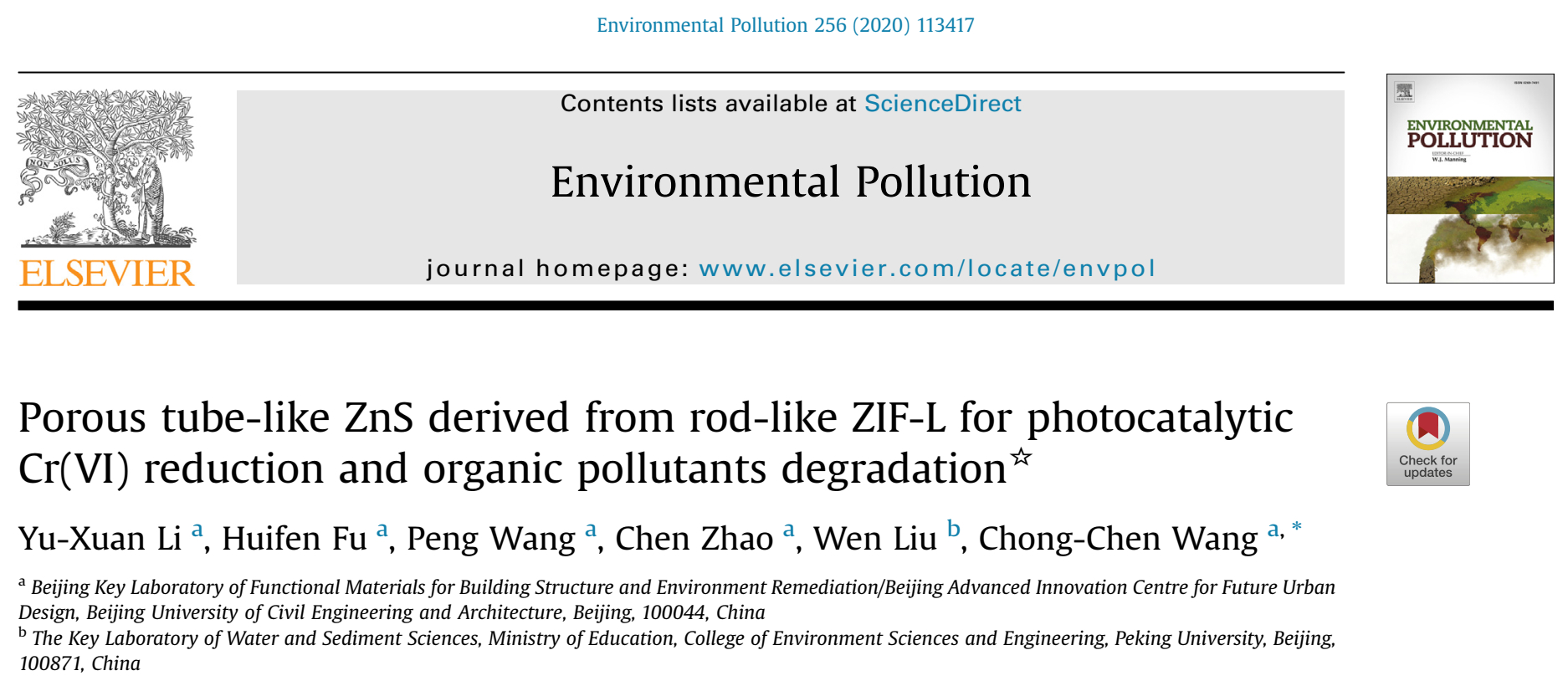 NMTer课题组硕士研究生李玉璇在《Environmental Pollution》(SCI索引,中科院二区TOP期刊,影响因子5.714)上发表论文。以棒状ZIF-L为自牺牲模板制备了多孔管状ZnS,并将其用于光催化还原Cr(VI)和降解有机污染物,讨论了pH等因素对光催化性能影响,深入分析了光催化机理,实验结果表明该ZnS具有较好的光催化性能。