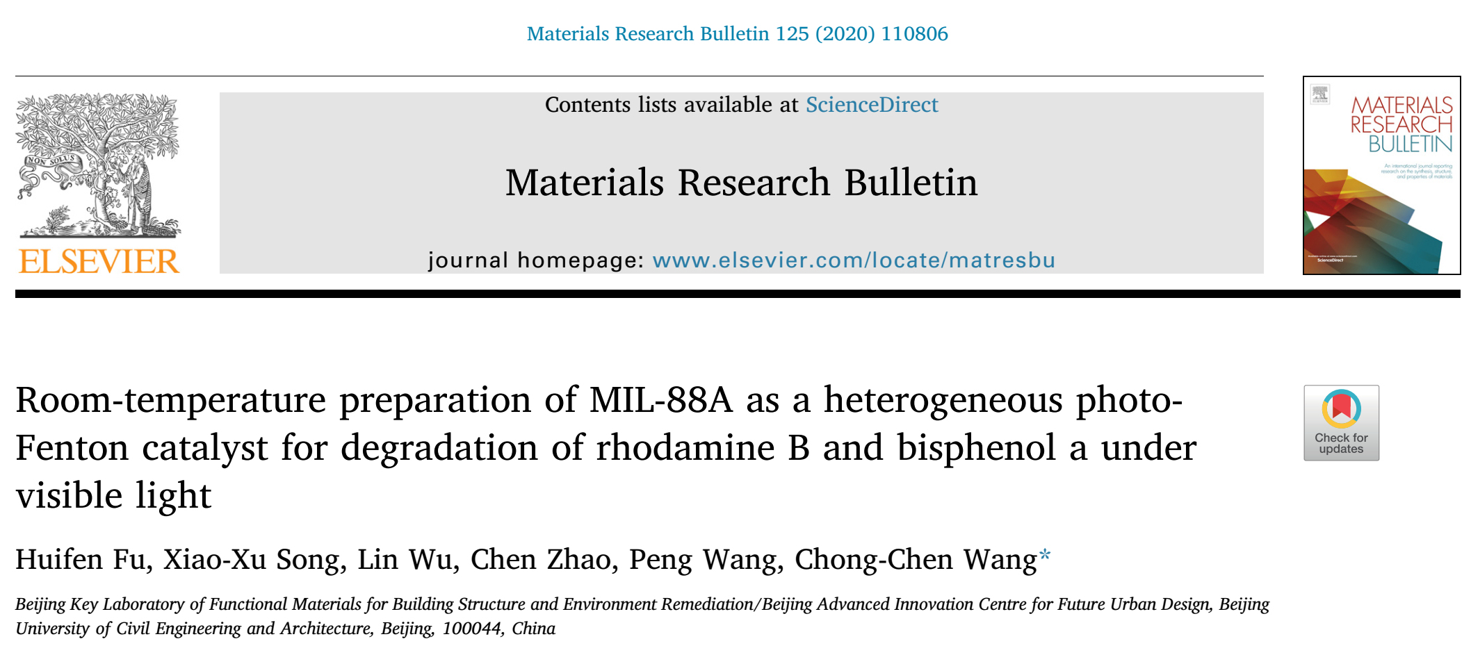 NMTer课题组付会芬老师在《Materials Research Bulletin》(SCI索引,中科院三区期刊,影响因子3.355)上发表论文,对MIL-88A的室温可控制备及其光芬顿催化降解罗丹明B和双酚A的性能、双酚A的降解路径、稳定性和循环使用性能进行了研究。