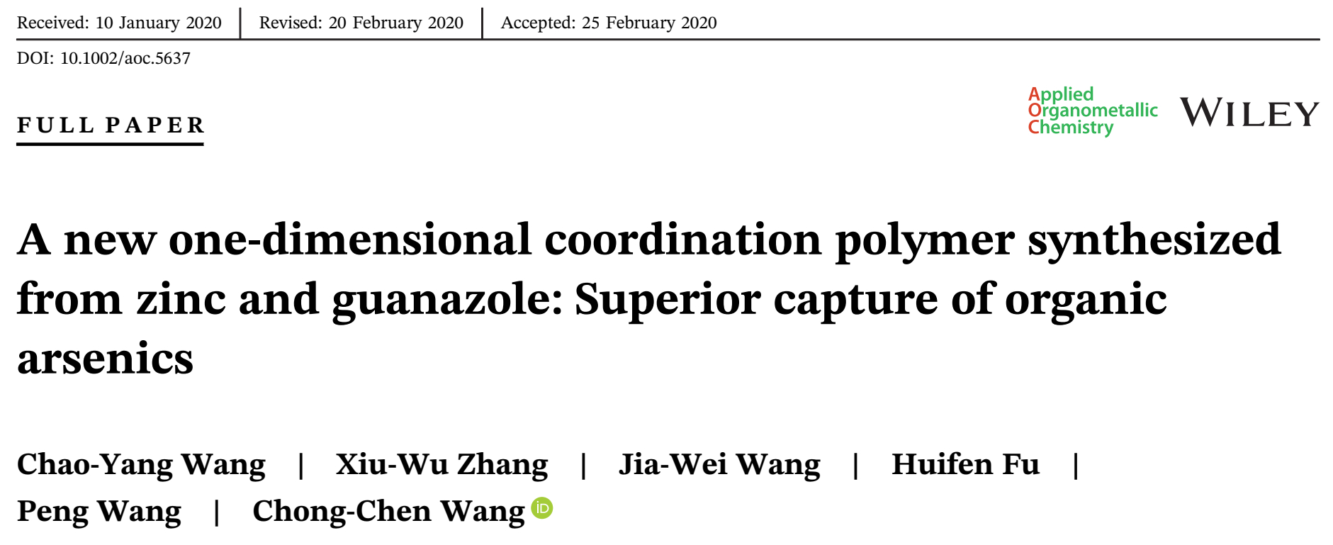 团队硕士研究生王朝阳在《Applied organometallic Chemistry》(SCI索引,中科院三区期刊,影响因子3.259)上发表论文,该工作通过均相法制备了一种新的水稳性配位聚合物(CPs) Zn2(datrz)2(bpy)Cl2 (BUC-70),研究了BUC-70用于吸附去除水中的p-ASA和ROX的性能,考察了BUC-70吸附p-ASA和ROX的动力学、热力学、离子干扰、真实水体中溶解性有机物(DOM)干扰以及在低浓度条件下对于p-ASA和ROX的吸附性能。为了探究其实际应用价值,将BUC-70负载于棉花上,测试了其对于p-ASA和ROX的突破曲线,结果显示BUC-70对于p-ASA和ROX的去除具有较好的应用前景。该研究为开发高效的吸附材料提供了材料基础和理论依据。