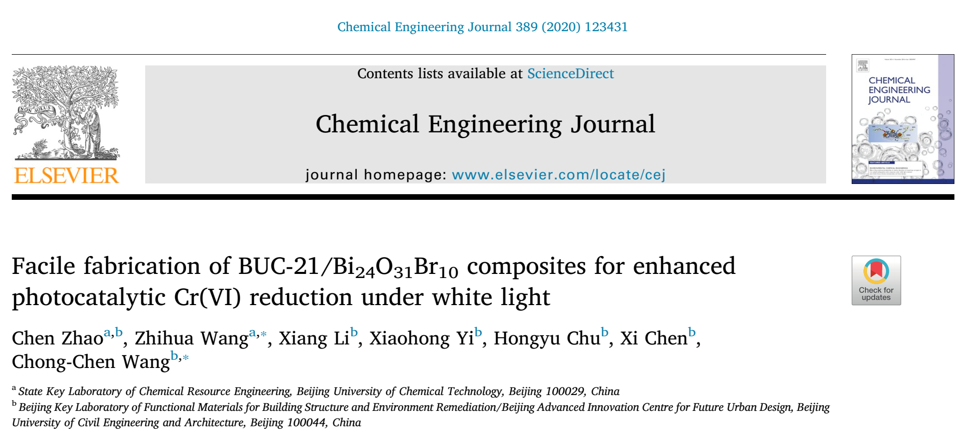 NMTer课题组赵晨老师在《Chemical Engineering Journal》(SCI索引,中科院一区期刊,影响因子8.355)上发表论文。BUC-21是本课题组以北京建筑大学命名的二维金属-有机骨架材料,为了进一步改善其光催化性能,首次采用球磨法简易制备了BUC-21/Bi24O31Br10异质结光催化材料。结果表明其可在白光照射下高效光催化还原Cr(VI)离子。同时,通过电化学分析、时间分辨光致发光衰减谱、活性物质捕捉实验、电子顺磁共振及密度泛函理论计算深入探讨了BUC-21/Bi24O31Br10异质结材料光催化还原Cr(VI)的反应机理,为MOFs/富铋型卤氧化铋复合材料应用于水体污染修复提供了重要科学依据。