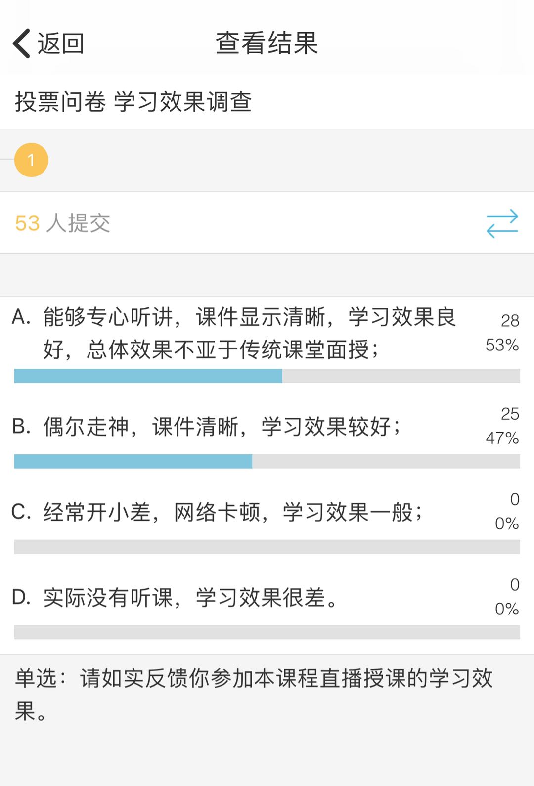 突如其来的疫情改变了我们的生活、工作和学习节奏。在经历了最漫长的冬天之后,学生和老师们都从来没有像现在这样盼望着开学。2020年2月26日是我难忘的一天,从教23年来第一次线上直播教学。我提前整理了书房、调试了电脑,还特意沐浴更衣,居然还有点紧张了,满满的仪式感。我利用腾讯会议直播结合云班课教学,学生到的很齐,都能提前上线。坐着面对屏幕讲课看不到学生也听不到他们的说话,刚开始还挺不适应。我就时不时的停下来点一个学生回答问题,一是听到他们的反馈才能感觉到我是在上课,二是想给学生一点压力防止他们走神或者悄悄溜走。课间休息的时候,我让学生们打开摄像头,我们一起在电脑屏幕上截屏合影留念。课后在云班课发布了直播教学效果问卷调查,同学们的反馈还不错,53%的学生认为直播教学效果不亚于课堂面授。这一天有点累,但是很充实,感觉很奇妙,应该是值得纪念的一天。