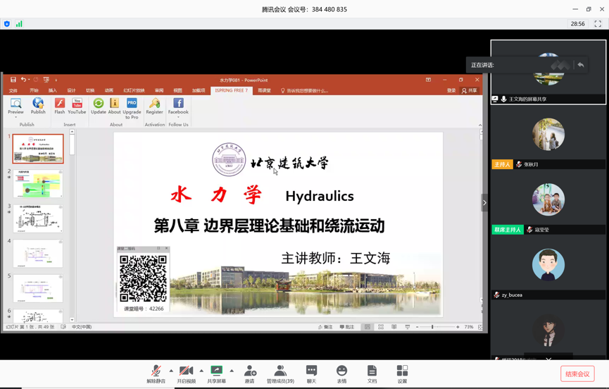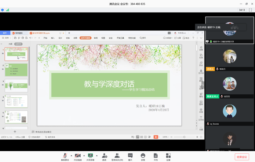 两位支部书记简单介绍支部情况后,教师代表王文海老师以自己的课程为例分享了自己的经验和体会。虽然是老教师,《流体力学》讲了有30遍,有一定的教学资料积累,但是依旧比较忐忑,也需要重新准备课件,需要准备更多的互动环节吸引学生的注意力。学生们每天线上学习也是特别多,比较累,有时上课会精力不集中,我们老师也能理解。90分钟课程我最少要做三次比较集中的线上互动,也希望同学们能积极的配合响应老师。另外,我把几乎每堂课每个知识点都重新画了动画效果应该还不错。研究生和本科毕设的线上指导用腾讯会议,讨论问题时电脑写屏很方便,同学截屏留存。讲课的课件和答疑记录发给学生方便复习。