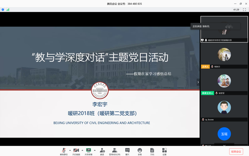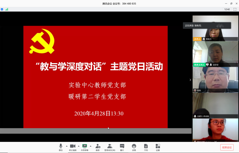 为进一步强化基层党组织在“教与学”过程中的党建引领作用,发挥党员在“教与学”过程中的先锋模范作用,促进教学质量和人才培养质量提升。2020年4月28日下午1:30,实验中心教师党支部与共建学生支部暖研第二党支部围绕当前线上授课、线上学习、线上指导的经验与改进主题,共同举办了“教与学深度对话”网上主题党日活动。会议由两个支部全体党员参加,支部书记寇莹莹和张秋月共同主持。