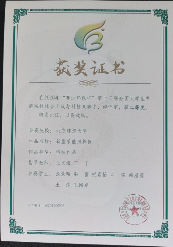 王文海老师、丁丁老师指导,张景昭、王淳、邱实、祝嘉怡、彭蕾、王闻卓等同学的参赛作品《新型节能搅拌器》荣获全国二等奖。