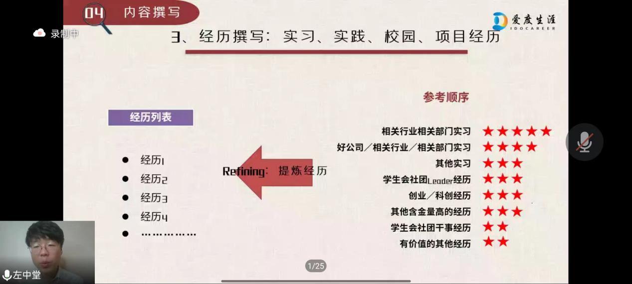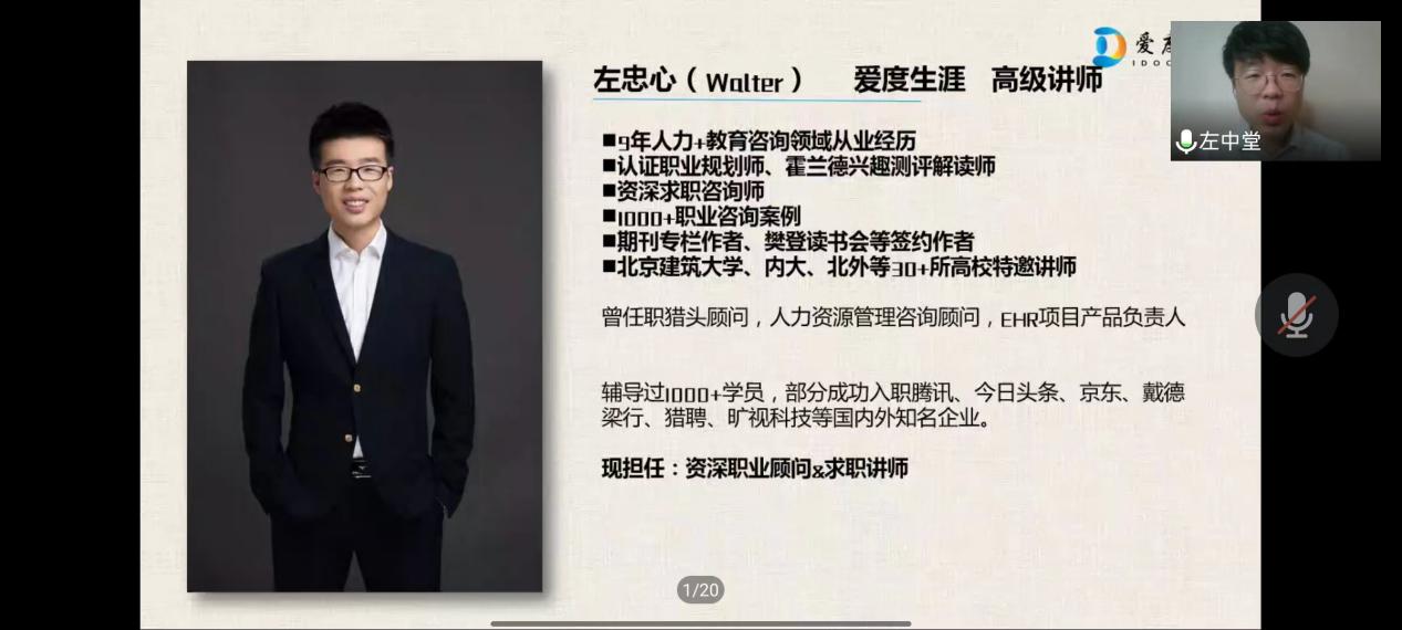 该次培训邀请了资深求职顾问爱度生涯高级讲师左忠心为同学们带来“简历撰写”专场培训。左老师具有9年人力和教育咨询领域从业经历,精心准备了满满干货和同学们分享。