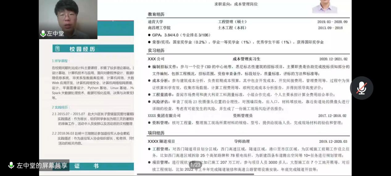 首先,左老师邀请大家自我诊断简历得分,并强调好简历至关重要。随后,从企业的筛选标准切入,讲授胜任力模型理念以此解读职位招聘需求。接着,左老师帮助同学们明确了简历结构样式,强调应届毕业生的简历模块排序应重点突出校内经历。此外,在简历内容选择上,左老师告诉同学们描述经历应使用“STAR法则”和“职位JD”的方式使简历更加系统、全面、抓人眼球。最后,左老师回答了同学们的提问,并预祝大家在大赛中取得好成绩。