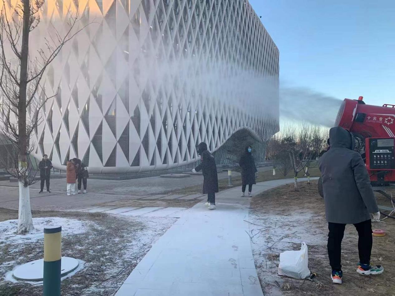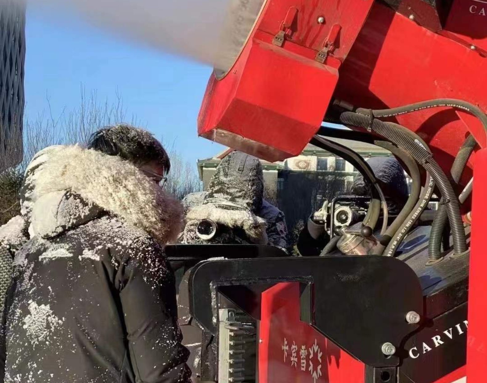 徐荣吉、吴海峰老师,清晨六点半带领学生开展室外造雪实验,实验场地成为校园内亮丽的雪景风景线和“网红”打卡地。此次实验主要目的是测试国产造雪机在各种环境条件下的造雪性能,为自主冰雪装备的发展做出支撑。