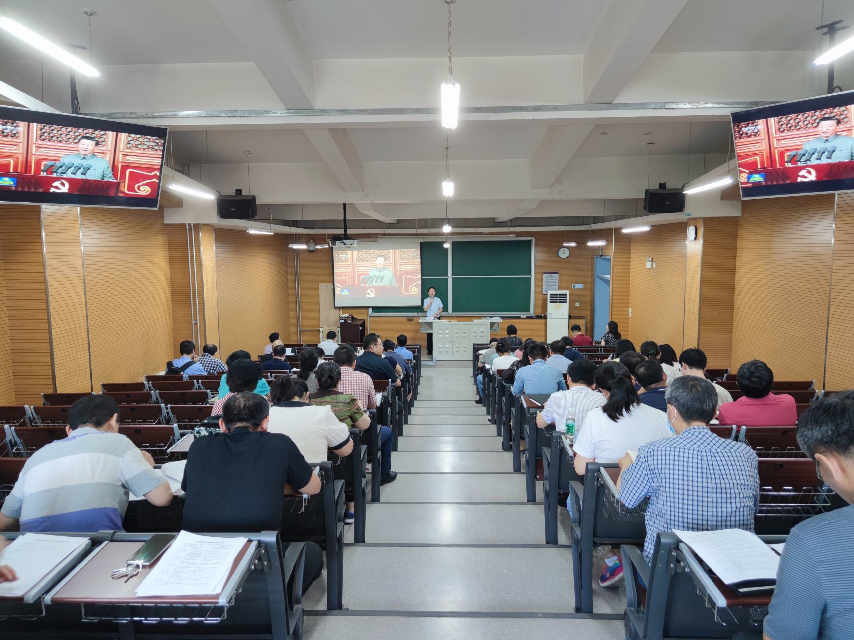 在学B-205召开全体教职工大会,深入学习贯彻习近平总书记“七一”重要讲话精神,进行干部试用期满考核及安排部署斗地主网页版