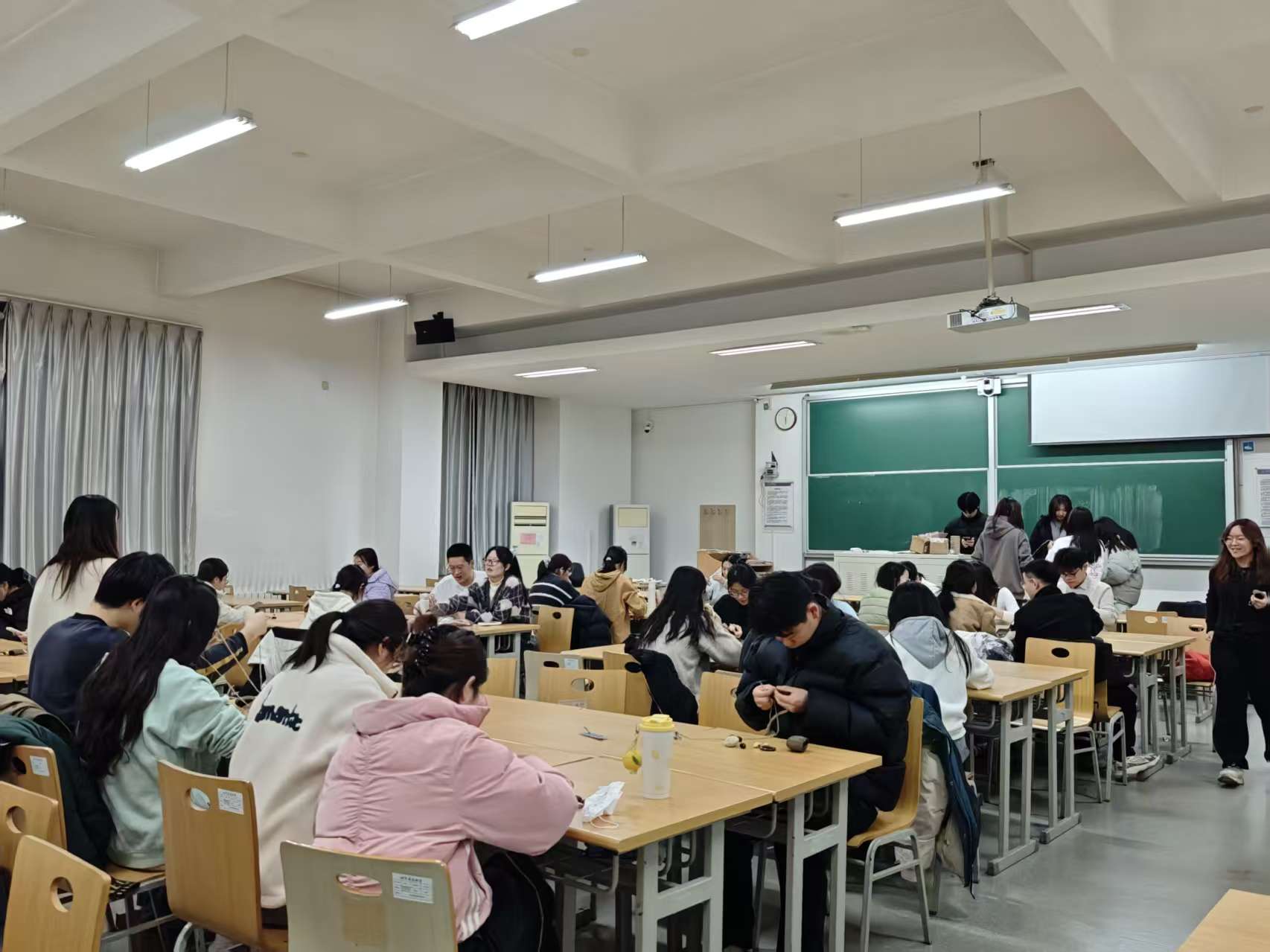 材料与工具发放完毕后,在现场工作人员的耐心指导和协助下,同学们纷纷挑选心仪的果壳,投入到风铃的制作过程中。大家参照黑板上的流程说明,严谨而专注地打造属于自己的果壳风铃。同学们在交流中分享设计灵感与创作理念,彼此启发、互相礼让,营造出融洽而活泼的现场氛围。