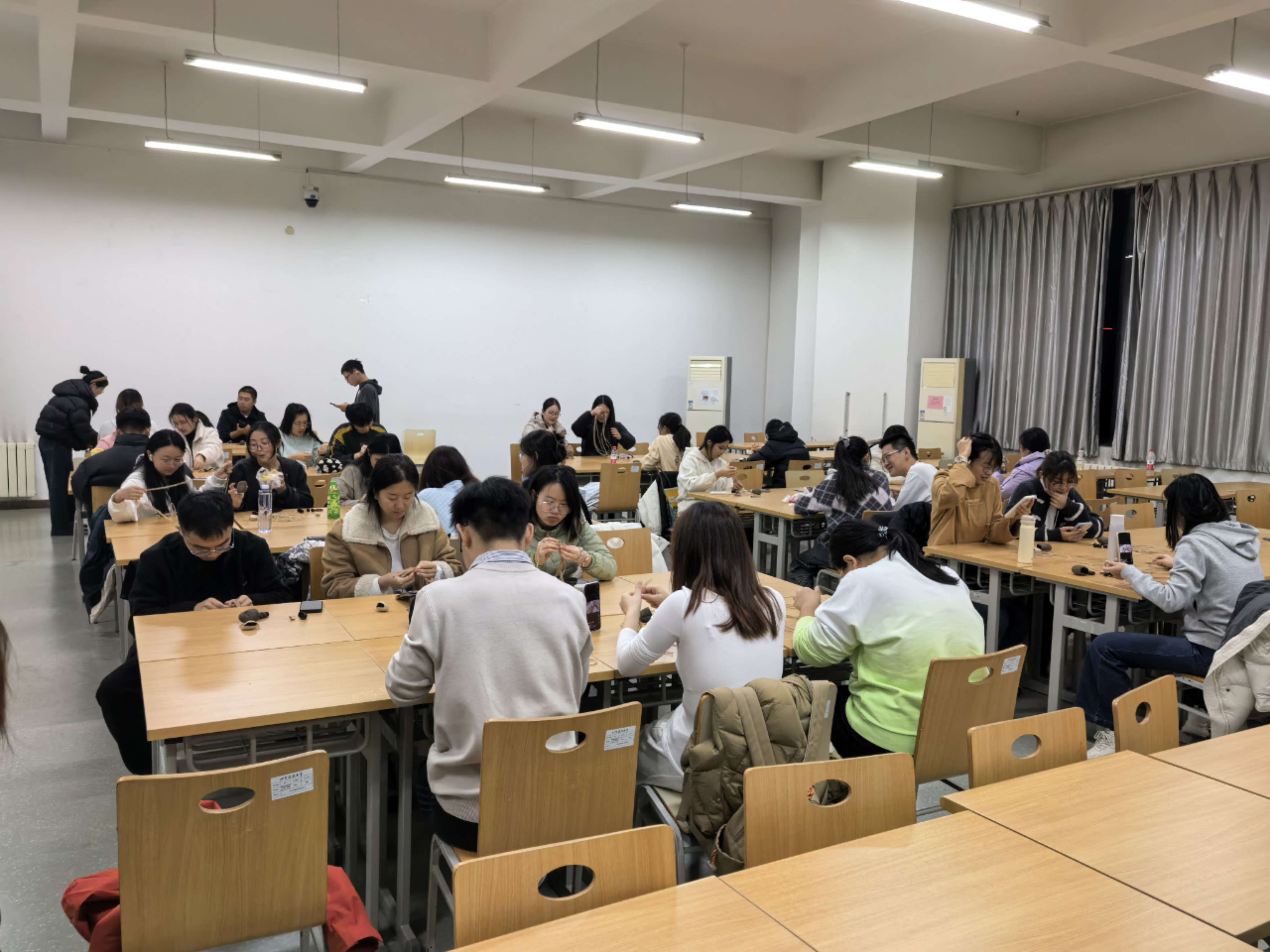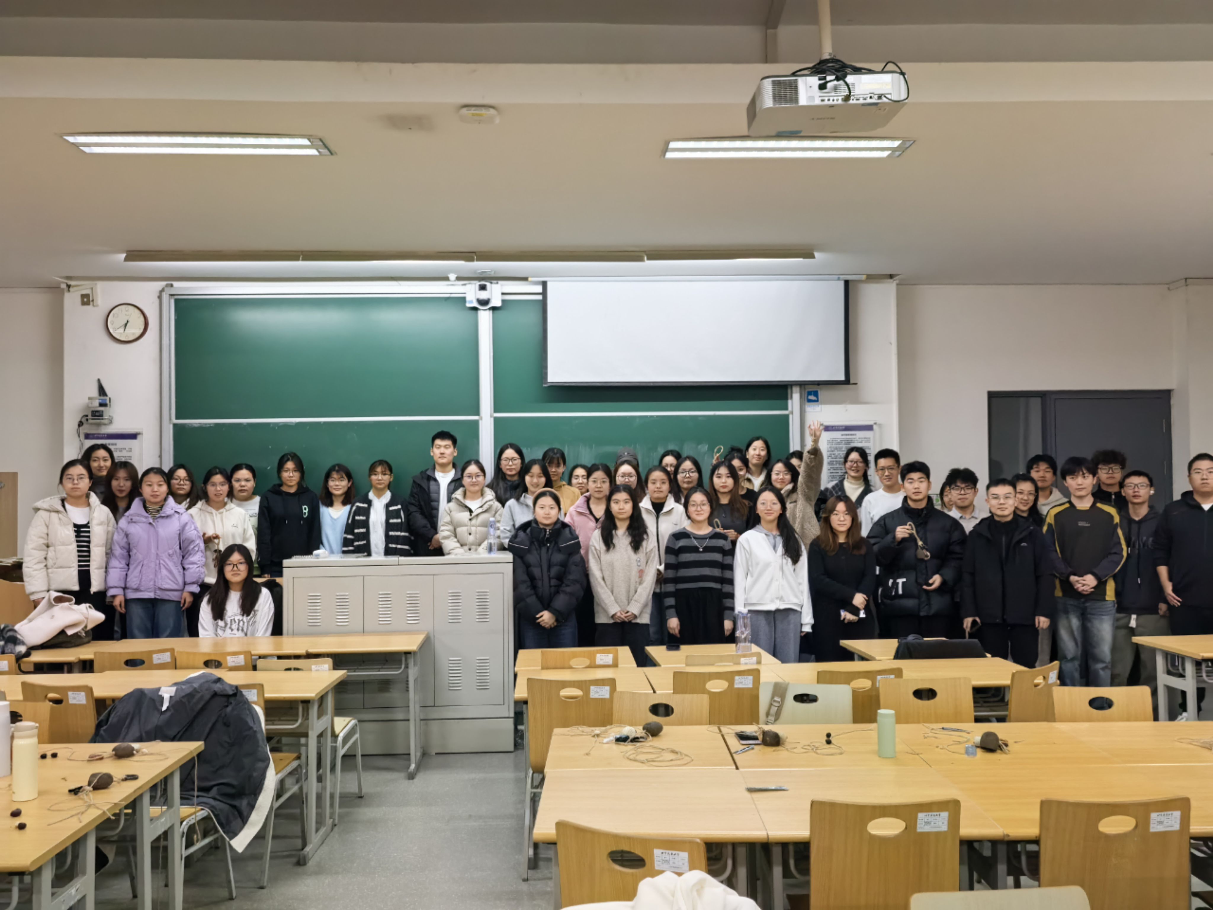 活动尾声,全体参与者合影留念。这张照片不仅记录了大家共同努力为缓解期中考试压力所营造的轻松时刻,也承载了为呵护学生心理健康所付出关怀的珍贵印记。整场活动为同学们打造了一个减压空间,让大家得以从繁重学业中抽身,在手工制作的愉悦中回归本真,进一步促进了彼此的理解与沟通,为构建更加和谐、友善的校园人际关系注入了新活力。