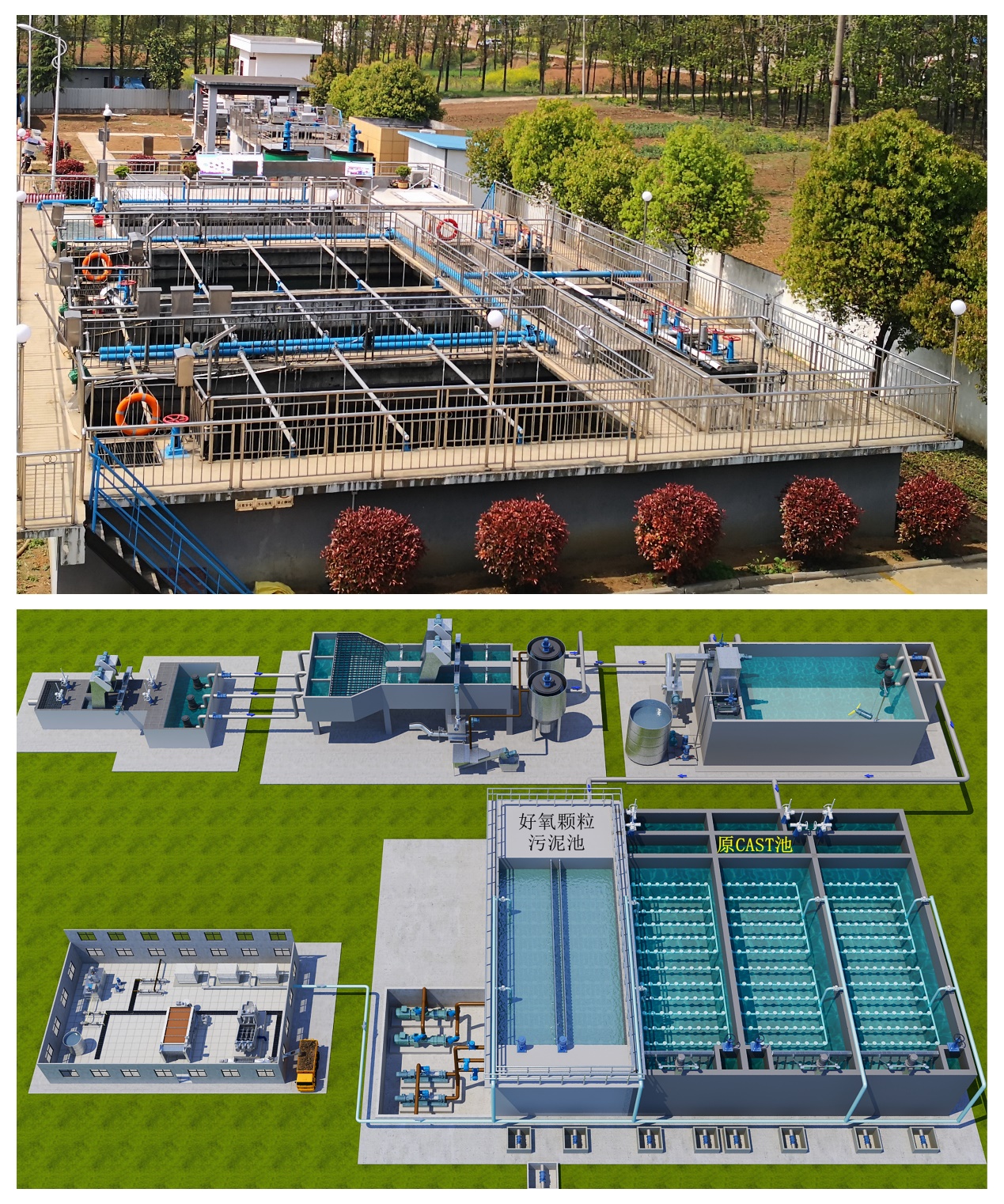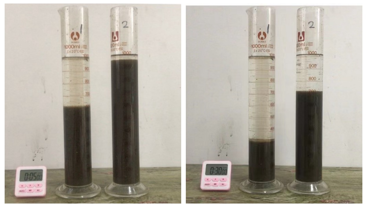 相较于传统活性污泥工艺,颗粒污泥工艺因其颗粒化形态,相同处理规模和负荷条件下,可节约占地50%,运行成本降低35%,大大提高污水处理效率,降低污水处理成本和能源消耗,是未来可持续污水处理技术的重要工艺。南阳颗粒污泥中试基地改造原CAST池(图2),采用SBR五阶段运行方式,现阶段已实现污泥颗粒化培养。颗粒污泥浓度达6600 mg/L,接近仍在继续运行的CAST工艺两倍(3500 mg/L),颗粒沉降性能远远高于传统工艺(图3);其池容仅为原CAST池1/4,但处理水量与剩余3/4体积原工艺处理水量相当;而出水水质远远高于原传统工艺;过程中完全不添加碳源和除磷药剂,大大降低处理成本。