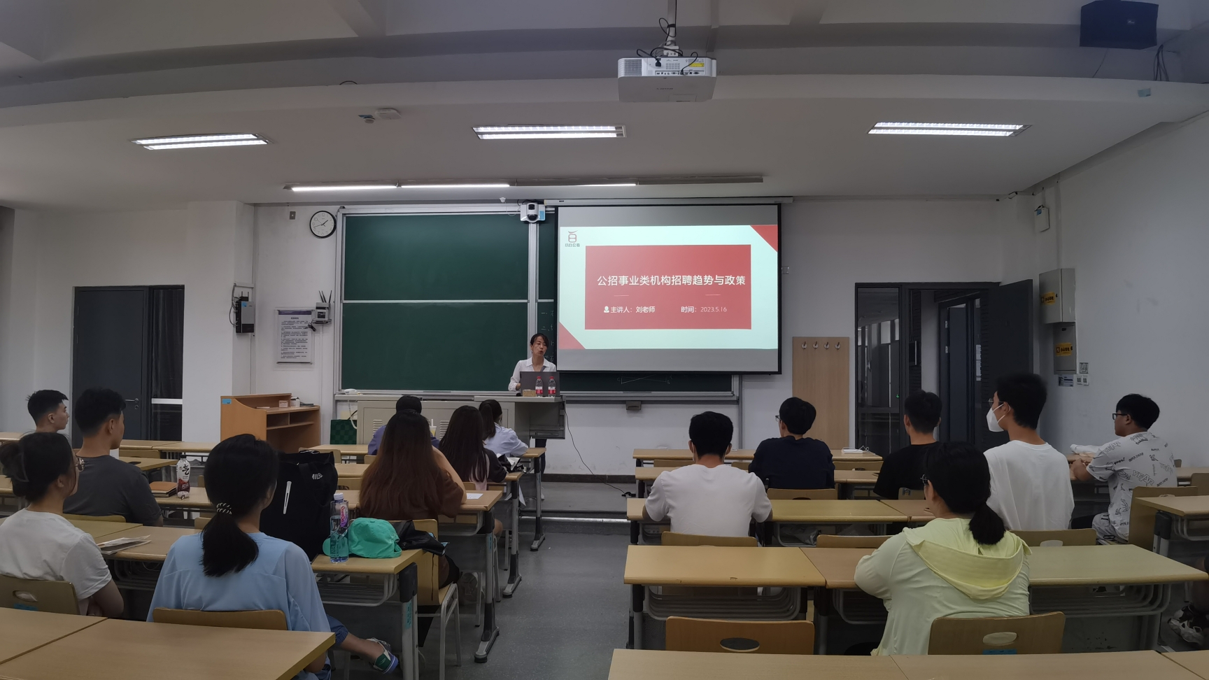 活动开始,刘老师结合近些年丰富的辅导经验,从公务员考试、事业单位、教师招聘、国企招聘、大学生村官、军队文职等五个方面的内容对同学们展开讲解就业选择,并针对我校学生的特点介绍了考编相关信息,提醒同学们要把握住应届生身份,合理备考,作出合理选择。随后刘老师以案例的方式,介绍了国考、京考和多数事业单位考试的题目、类型、考试形式等做分类的讲解说明,让同学们对公考有了初步的了解。接下来,刘老师围绕报考条件、考试流程、考试内容等方面具体展开讲解。针对同学们的疑惑,有选择地补充解答备考以上类型公职人员的其他问题。除此以外,刘老师就职业发展、岗位选择、职位晋升方面内容,方便同学们综合多方面条件进行备考抉择。