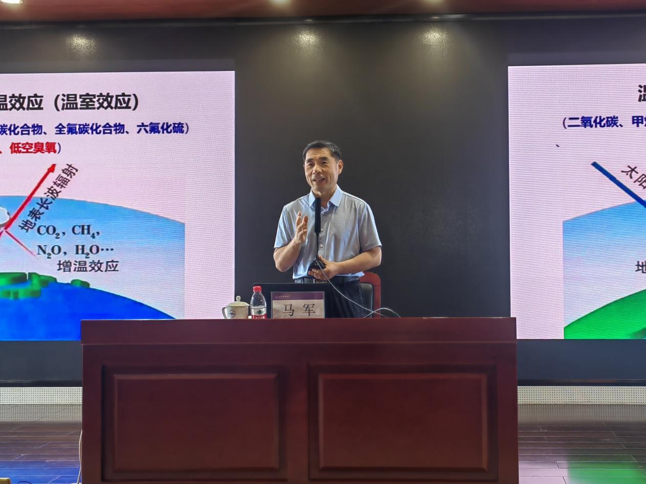 、环境学科近期取得的突出成果表示祝贺。马军院士在报告中指出,在碳中和愿景下,城市面临着进出物质失衡、城市热岛效应、水资源短缺、环境污染等一系列问题,他深入浅出地为师生解释了背后的科学问题。他指出,随着城市发展,会出现很多“城市病”,未来城市规划应从战略高度与源头上进行减污,要由大区域的碳平衡向城市碳平衡发展,控制城市热岛效应也需要逐步实现城市碳平衡;要从单纯的污染控制向环境综合整治和资源利用方向发展,实现源头减污、过程节能与资源循环利用。
