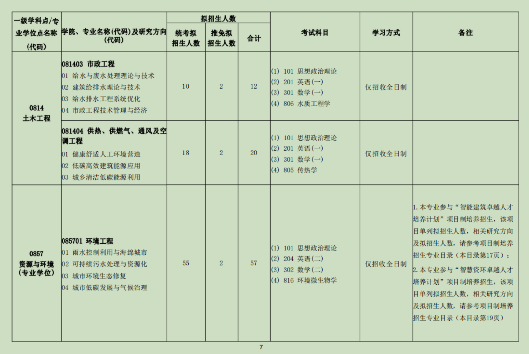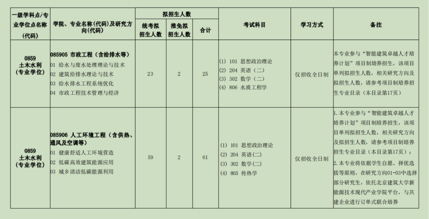 市政工程(含给排水等)(085905)专业领域设置5个研究方向:(1)给水与废水处理理论与技术; (2) 建筑给排水理论与技术 ;(3)给水排水工程系统优化;(4)市政工程技术管理与经济;(5)智能建筑绿色消纳。