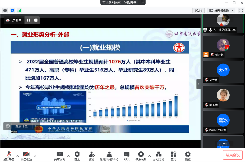 已经毕业的本科生和研究生的毕业去向、行业选择、择业单位类型以及就业地域分布等情况,讲述了升学和求职的重要时间节点,并对就业准备进行详细讲解。并对相关手续办理程序作出说明,并叮嘱同学们在毕业阶段加强个人防范意识,慎重做出选择,在保证顺利完成学业的同时,找到更加适合每位同学的方向。
