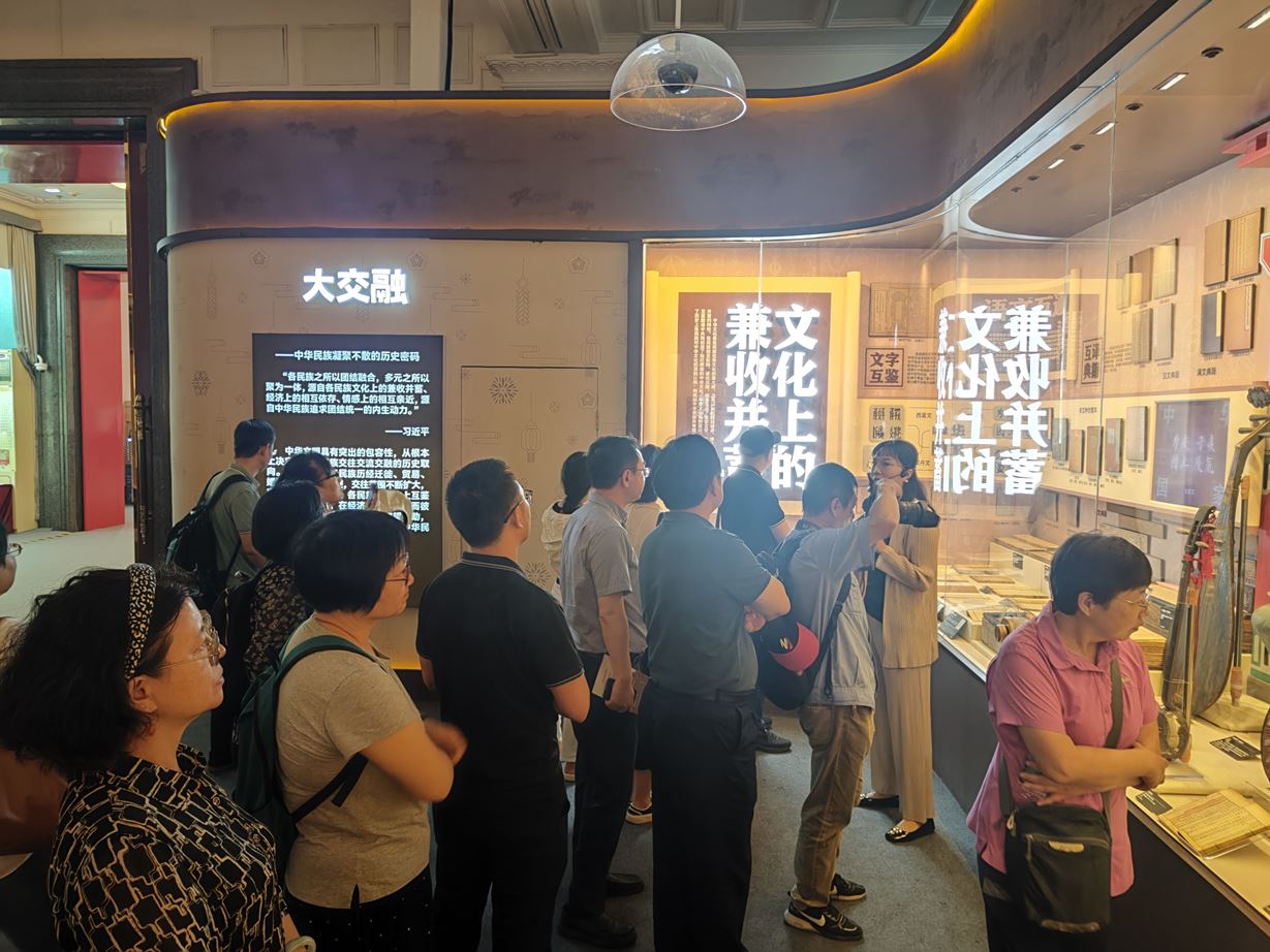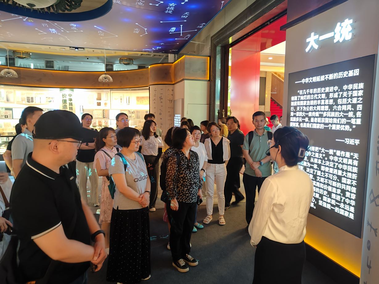 虽然夏日炎炎,教学科研等工作也进入期末的攻坚阶段,依然挡不住大家交流学习的热情,近三十位教职工分别从两校区乘车前往参观游览。当大家置身于民族文化宫展厅内时,映入眼帘的是“大一统”三个字,历史的厚重感和时代的责任感扑面而来,随后的参观学习过程中,依次参观“大一统”、“大交融”、“大团结”三个单元。在馆内讲解员的细致讲解下,大家如同徜徉在中华民族共同体形成发展的历史长卷中,馆内陈列的极具民族特色的古籍、服饰、青铜器等文物,仿佛也在诉说着中华民族的发展历史和辉煌成果。