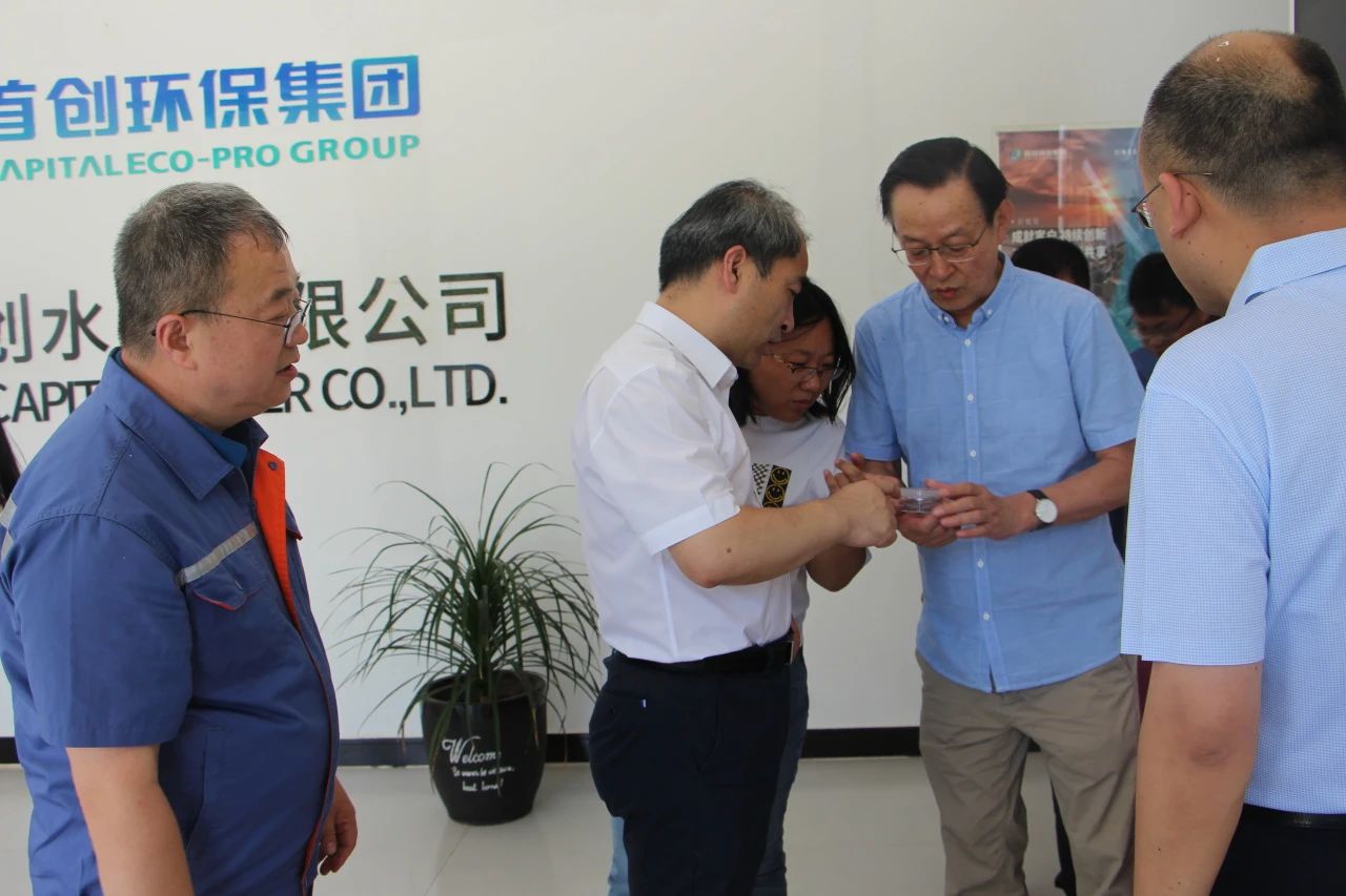 李军锋实地考察了好氧颗粒污泥技术运用于污水处理的各环节情况,对项目建设情况、运行现状、颗粒化程度、处理能力、污泥形状及技术成果等进行详细的了解。郝晓地教授、吴远远总监对好氧颗粒污泥技术创新的研发历程、应用现状、创新技术的特点及研发与应用成果一一进行汇报。