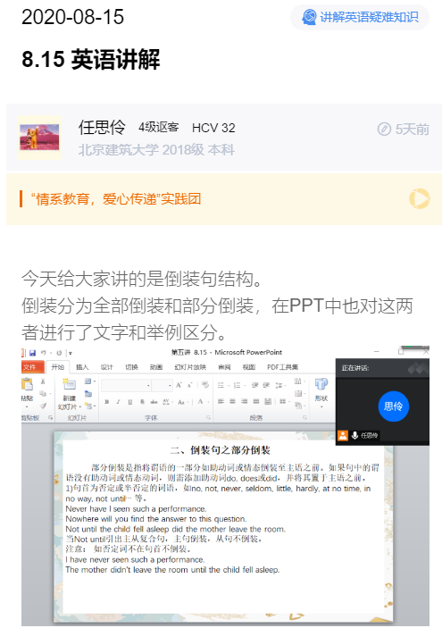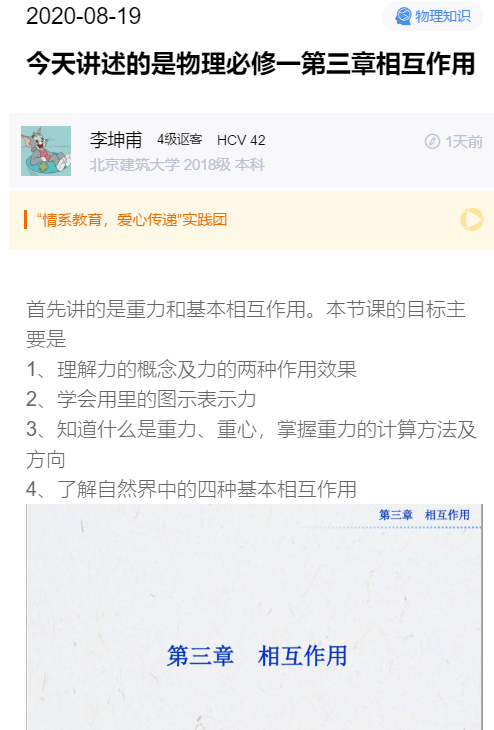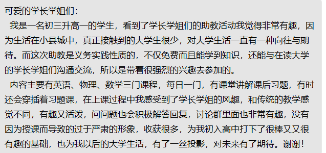 实践团从建立初期到选定科目、备课,进行了精心的准备工作。实践团成员们对学生的学习做出合理规划,在课前认真备课,课堂细致讲解、课后耐心辅导。为那些渴望学习到知识的同学们提供学习平台和途径。从2020年8月3日开始,线上课堂正式开始授课,面向的对象是初三毕业即将升入高中的学弟学妹,主要教授的科目为英语、物理、数学。每天固定时间为11:00-12:00在腾讯会议上进行即时的授课,课下也与学弟学妹们积极互动,随时在QQ上进行答疑解惑。