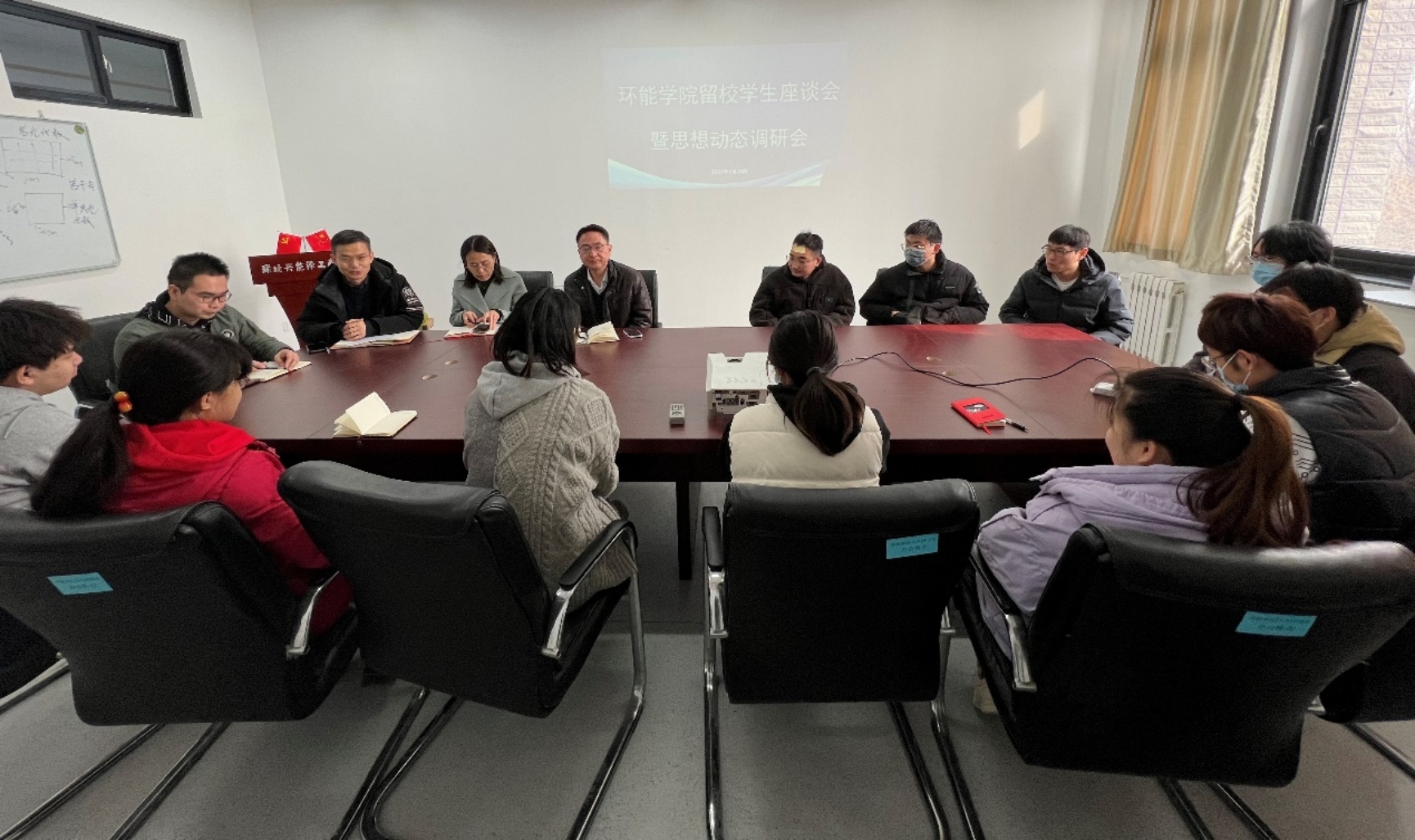 在学B236会议室召开假期留校学生座谈暨思想动态调研会。院党委书记冯宏岳、党委副书记、副院长高瑞静、各年级辅导员以及假期留校研究生参加会议,会议由院党委副书记孙强主持。