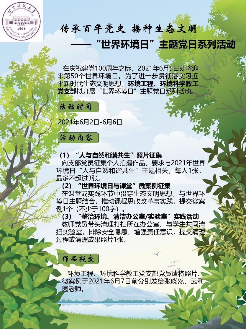 在庆祝建党100周年之际,迎来了第50个世界环境日。为了进一步贯彻落实习近平生态文明思想,环境工程、环境科学教工党支部在2021年6月2日-6月6日期间开展了“传承百年党史,播种生态文明”世界环境日主题党日系列活动。