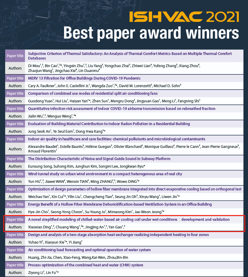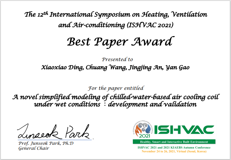 近日,我院硕士生丁晓晓题为“A novel simplified modeling of chilled-water-based air cooling coil under wet conditions: development and validation”的论文在ISHVAC2021国际供热通风及空气调节学术会议中获得“最佳论文奖”。2021年第12届ISHVAC国际学术会议由韩国主办,于11月24日至26日线上召开。ISHVAC系列会议最早发起于清华大学,已历时1991,1995,1999,2003,2007,2009,2011,2013,2015,2017,2019年共十一届,目前是由中国发起、暖通空调领域最有影响的国际学术会议之一。本届会议系首次走出国门举办,由韩国建筑可持续环境与设备系统研究院(KIAEBS)承办,并得到韩国旅游发展局、首尔市政厅、美国采暖制冷与空调工程师协会(ASHRAE)等机构和组织支持。