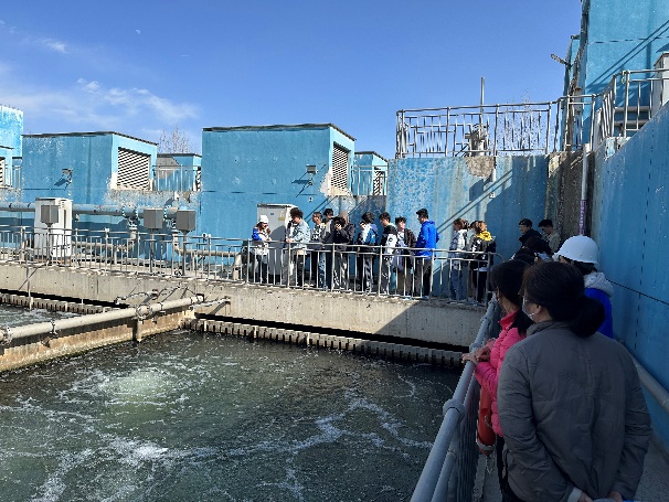 在杨琎、齐欣宇老师和企业相关工作人员的带领下,同学们依次参观了污水厂和再生水厂,现场学习污水处理的工艺流程,认真观摩和了解粗格栅、细格栅、沉淀池、曝气池等处理设施运行情况,通过将课本所学知识带入实践学习,加深了对专业知识的理解。