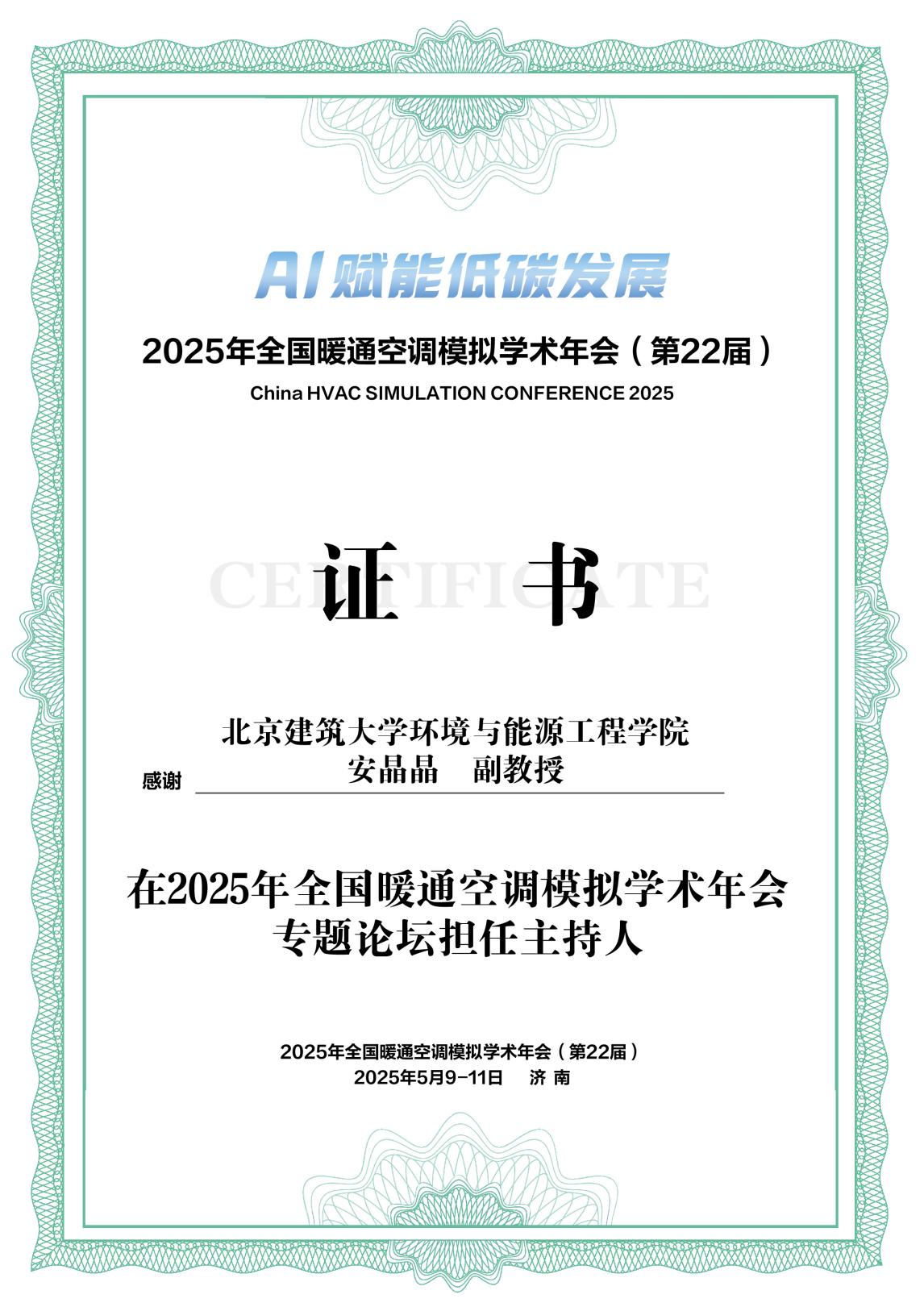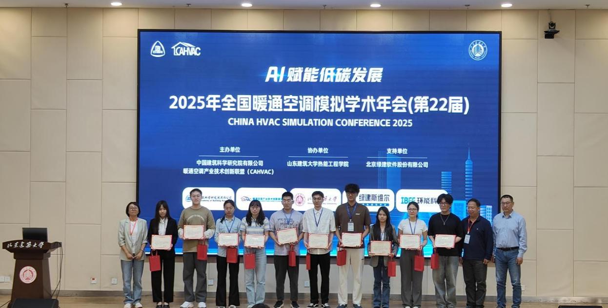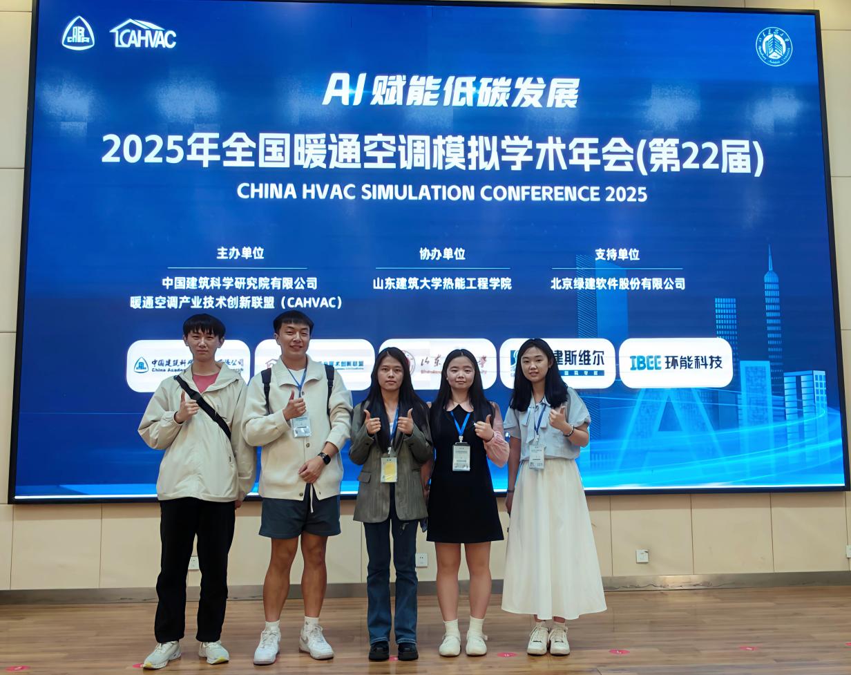 近日,我院师生参加在山东建筑大学举办的第 22 届全国暖通空调模拟学术年会。该会议自1983年创办以来,每两年一届,已成为我国建筑环境与能源数字模拟技术领域的重要学术会议。本次年会以“AI 赋能低碳发展”为主题,聚焦行业前沿,吸引全国320余位专家、师生及业界代表参会,为行业技术交流与发展搭建重要平台。