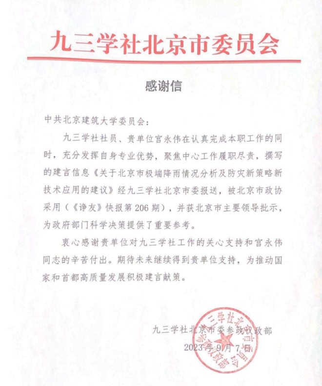 宫永伟教授的《关于北京市极端降雨情况分析及防灾策略新技术应用的建议》被市政协采纳。九三学社专门发信致谢斗地主网页版。
