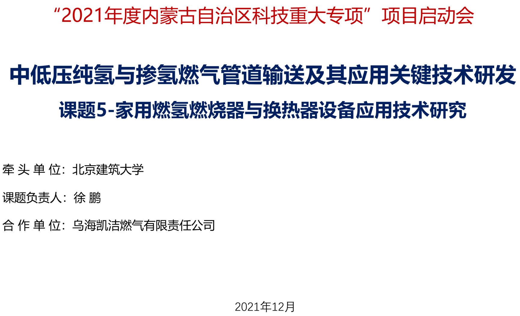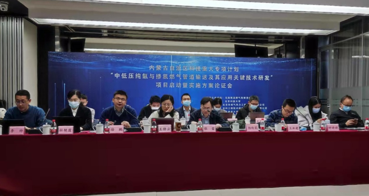 内蒙古自治区科技重大专项计划"中低压纯氢与掺氢燃气管道输送及其应用关键技术研发”项目,于2021年12月2日在北京科技大学天工大厦与内蒙古乌海市两地及线上同时召开项目启动暨实施方案论证会。中科院院士、上海大学张统一教授全程主持了方案论证会。