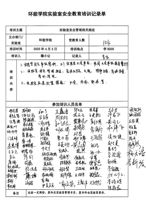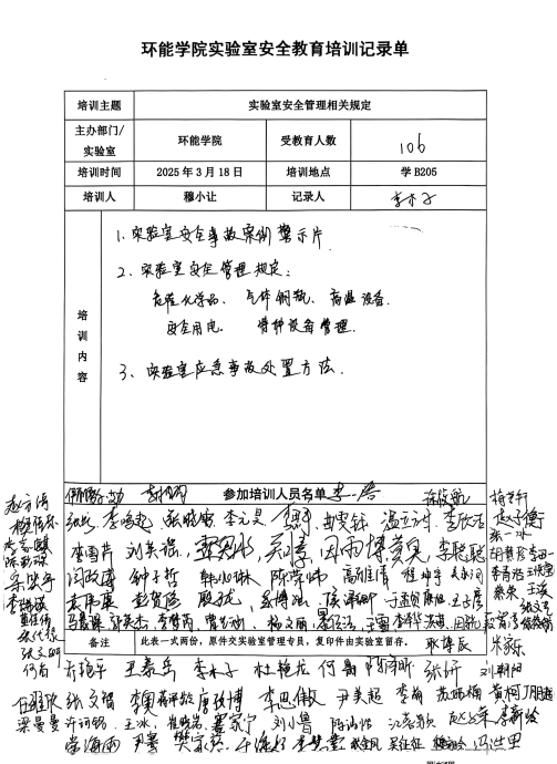 随后,实验室专职管理员穆小让对研究生开展安全培训,观看了实验室安全教育警示教育片,结合《高等斗地主网页版实验室安全规范》、《高等斗地主网页版实验室安全检查项目表》等文件,围绕危险化学品的分级分类、危险化学品存储要求、危险化学品使用与防护、危险废物处置、气瓶安全使用注意事项、特种设备管理、高温设备安全操作、实验室安全用电以及实验室存在的隐患问题等作了详细的讲解。