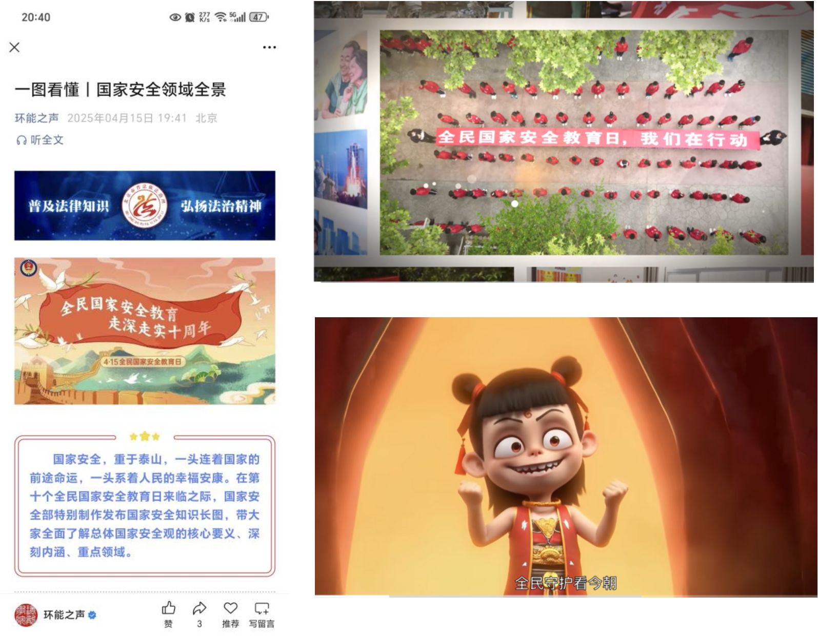 宣传大屏,滚动播放国家安全部官方发布的《你的样子》、《同行》、《魔童归来!哪吒天团跨界守护国家安全》等宣传视频,以同学们短视频喜闻乐见的方式向老师和同学们宣传科普国家安全,日均覆盖师生2000余人次。