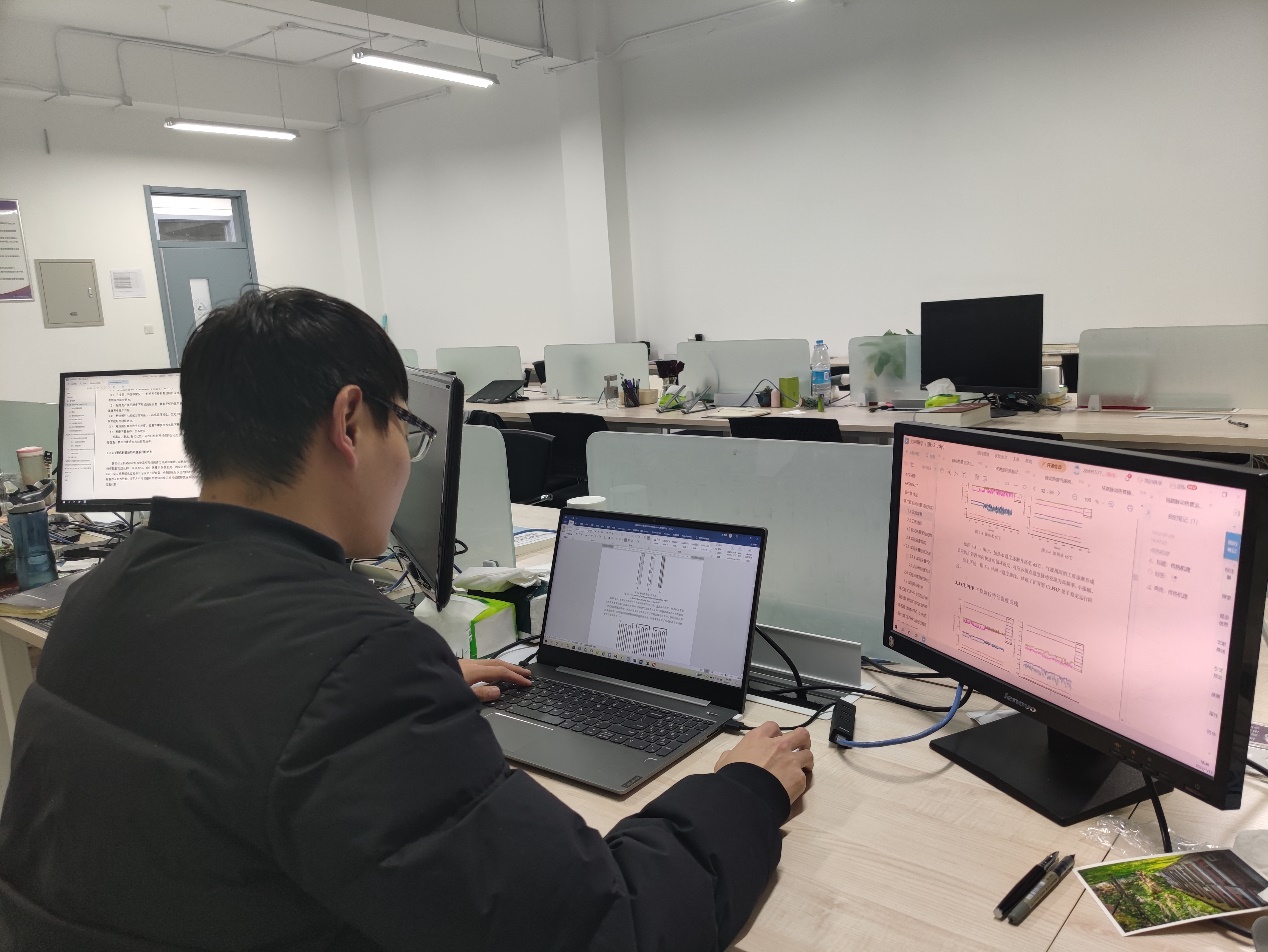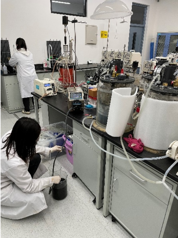 在中—荷中心实验室,研究生在紧锣密鼓按照计划开展小试与中试设备配合实验,围绕污泥资源与能源回收及污水污染物去除、工艺优化等方面进行探究。有的同学在研修工位进行数据整理和论文撰写工作。