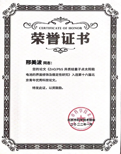 邢美波部分获奖和荣誉证书