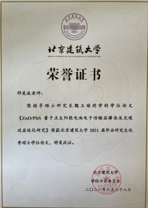 她积极落实国家双碳发展战略,承担国家自然科学基金项目《纳米蓄冷工质中CNTs的定向调控及凝固过程强化机理研究》、北京未来城市设计高精尖创新中心重大项目《量子点建筑太阳能电池的高效率的机理研究和高性能器件的设计开发》等多个课题;以第一作者发表SCI论文20余篇,90%一区论文,单篇论文被引频次平均60余次,发表论文入选北京青年优秀论文,荣获“建大英才”“优秀毕业设计指导教师”等称号。