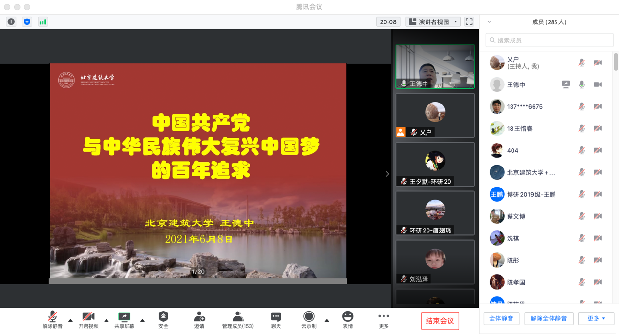 大家听取报告后,纷纷畅谈自己的收获和体会。暖研第二党支部张严匀说,中国的历史充满跌宕起伏。不忘初心,方得始终,一百年来从建党的开天辟地,到新中国成立的改天换地,到改革开放的翻天覆地,再到十八大以来取得的历史性成就。党的百年历史充分说明了党是实现中华民族伟大复兴梦的坚强领导者。市政研究生党支部的王愔睿认为,王老师从大历史观的角度分析了我国从领先世界到由盛转衰,再到伟大复兴的历史背景,让我们更加坚定了实现中华民族伟大复兴的决心,以及为此进行长期奋斗的信心。我们正处于实现中国伟大复兴的关键阶段,我们要努力提高专业水平,在专业领域接过上一代人的接力棒,承上启下,为实现中国梦而持续奋斗。