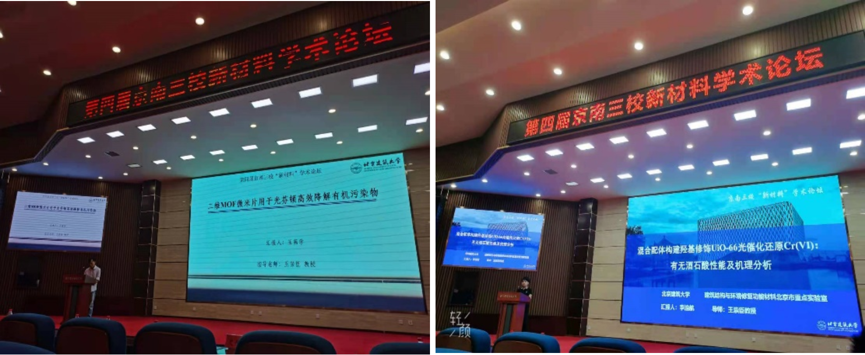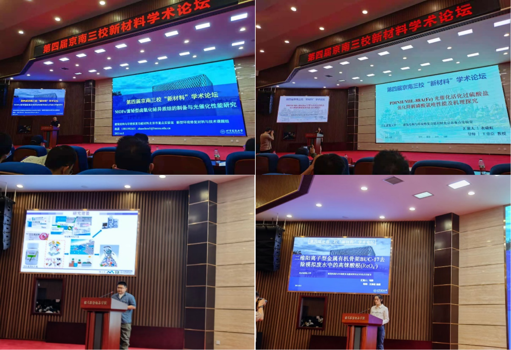 赵晨老师、博士生衣晓虹、博士生王茀学、博士生王朝阳、硕士生马静和硕士生李渝航在学术论坛中分别做了题为“MOFs/富铋型卤氧化铋异质结光催化性能研究”、“PDINH/MIL-88A(Fe)光催化活化过硫酸盐强化降解磷酸氯喹性能及机理探究”、“二维MOF微米片用于高效光芬顿降解有机污染物”、“一种新型的荧光Eu-MOF比率检测喹诺酮类抗生素和选择性检测四环素类抗生素”、“二维阳离子型金属有机骨架BUC-17去除模拟废水中高铼酸根(ReO4-)”和“混合配体构建羟基修饰UiO-66光催化还原Cr(VI):有无酒石酸性能及机理分析”为题的口头报告。我校研究生精彩报告得到了与会师生的广泛称赞,充分展示了我校研究生培养的水平和质量。