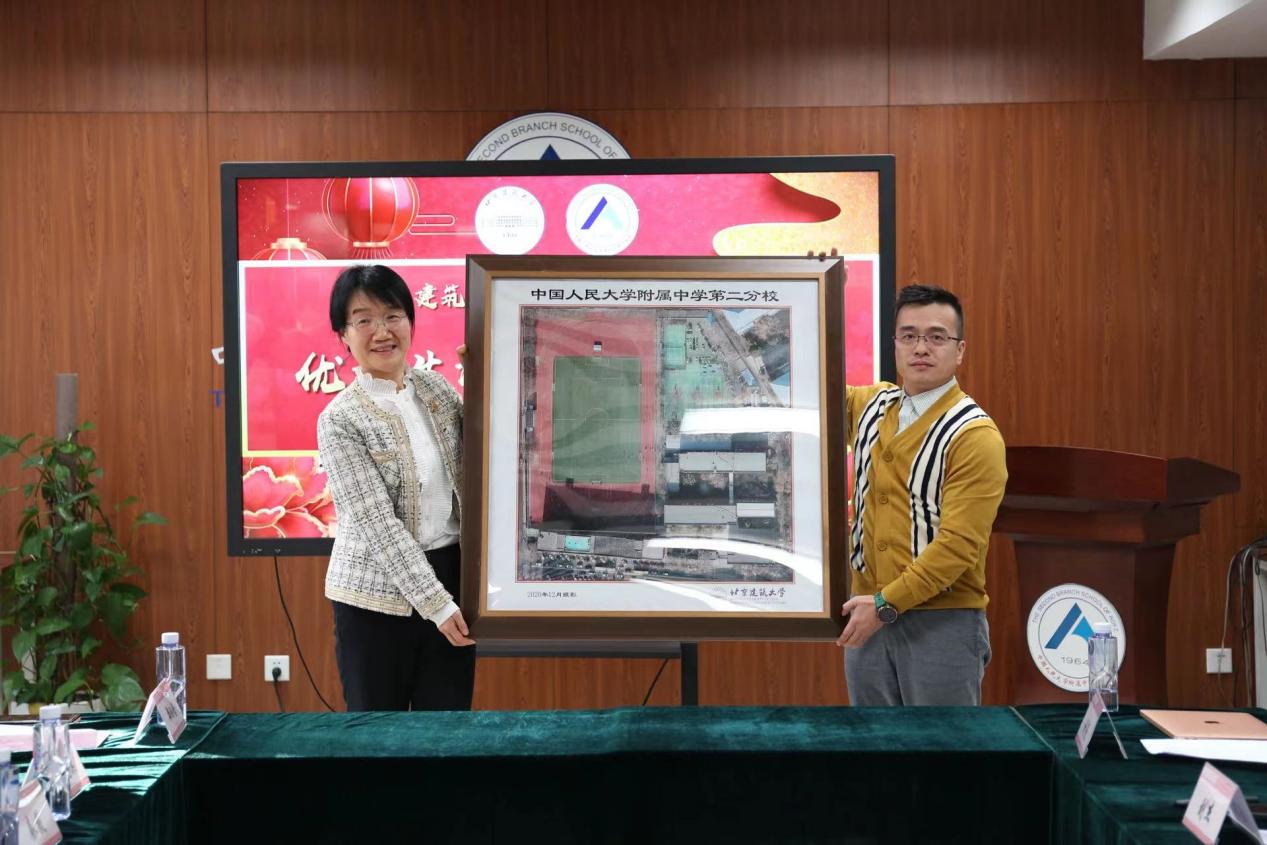 冯宏岳代表我校向中国人民大学附属中学第二分校授予“优质生源基地”牌匾,黄鹤向中学赠予我校制作的“中国人民大学附属中学第二分校校园卫星影像地图”。