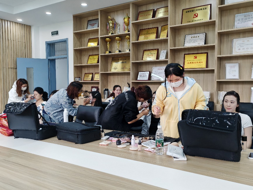 化妆师们早早地来到了准备室,为即将参加合唱的师生们进行化妆和造型设计。在化妆师们的精心打造下,师生们以最佳的状态和形象登上舞台。