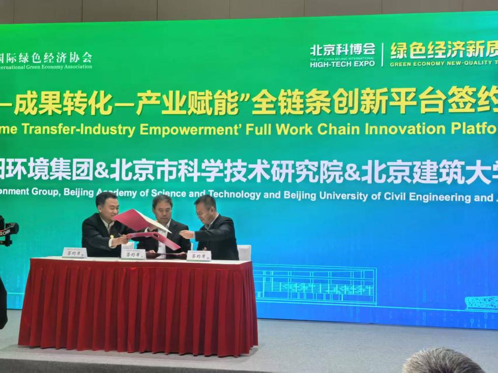 会议期间,为加快产学研协同创新,赋能科技成果转化落地,我校与北京市科学技术研究院、朝阳环境集团签署“技术研发-成果转化-产业赋能”全链条创新平台战略合作协议。我校科发院副院长薛重华代表北京建筑大学与北京市科学技术研究院资环所张忠国所长、朝阳环境集团的高猛龙总经理共同出席签约仪式。
