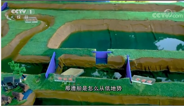 之后,镜头切换到南旺水利工程枢纽的现场,李晓玉以场外连线方式,利用团队自制的简易版沙盘模型,分享了该工程的运行原理。