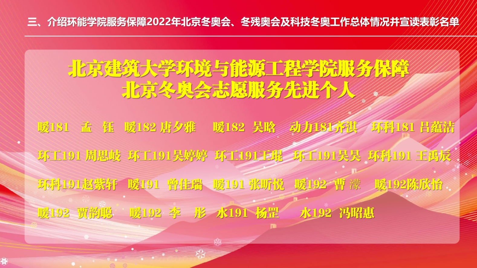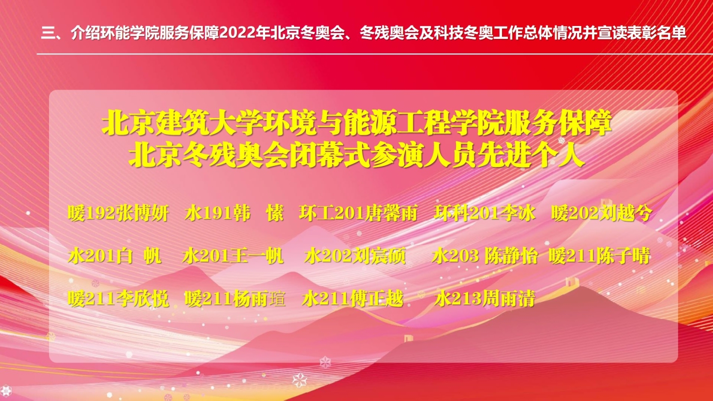 在校党委的统一领导下,充分发挥学科人才优势,汇聚专业团队,传承红色基因,书写百年老校的奥运答卷,始终将完成好服务保障北京冬奥会、冬残奥会各项任务作为光荣的政治任务和历史使命。在科技冬奥、志愿者服务和冬残奥会闭幕式的演出环节出色完成了党和国家交付的各项任务,以实际行动践行了“胸怀大局、自信开放、迎难而上、追求卓越、共创未来”的北京冬奥精神。对全院师生继续发展和弘扬北京冬奥精神,提出了几点希望。一要深入学习贯彻习近平总书记在北京冬奥会、冬残奥会总结表彰大会上的重要讲话精神,深刻认识“两个确立”的决定性意义,增强“四个意识”、坚定“四个自信”、做到“两个维护”,将北京冬奥会宝贵精神财富转化为爱党报国的实际行动;二要讲好冬奥故事,要总结提炼好、充分运用好、传承发扬好志愿服务精神,为更多人讲述冬奥背后北建大学生的感人事迹,不断丰富志愿服务精神内涵,进一步强化实践育人作用,凝聚奋进力量。三要要大力弘扬“胸怀大局、自信开放、迎难而上、追求卓越、共创未来”的北京冬奥精神,从冬奥精神中汲取力量,将冬奥精神真正内化为个人成长成才的精神力量,在未来的工作、学习中发挥作用,增强使命担当,以专业优势,积极投身生态文明建设的事业中,为实现“碳中和”、“碳达峰”双碳目标,作出环能人应有的贡献。