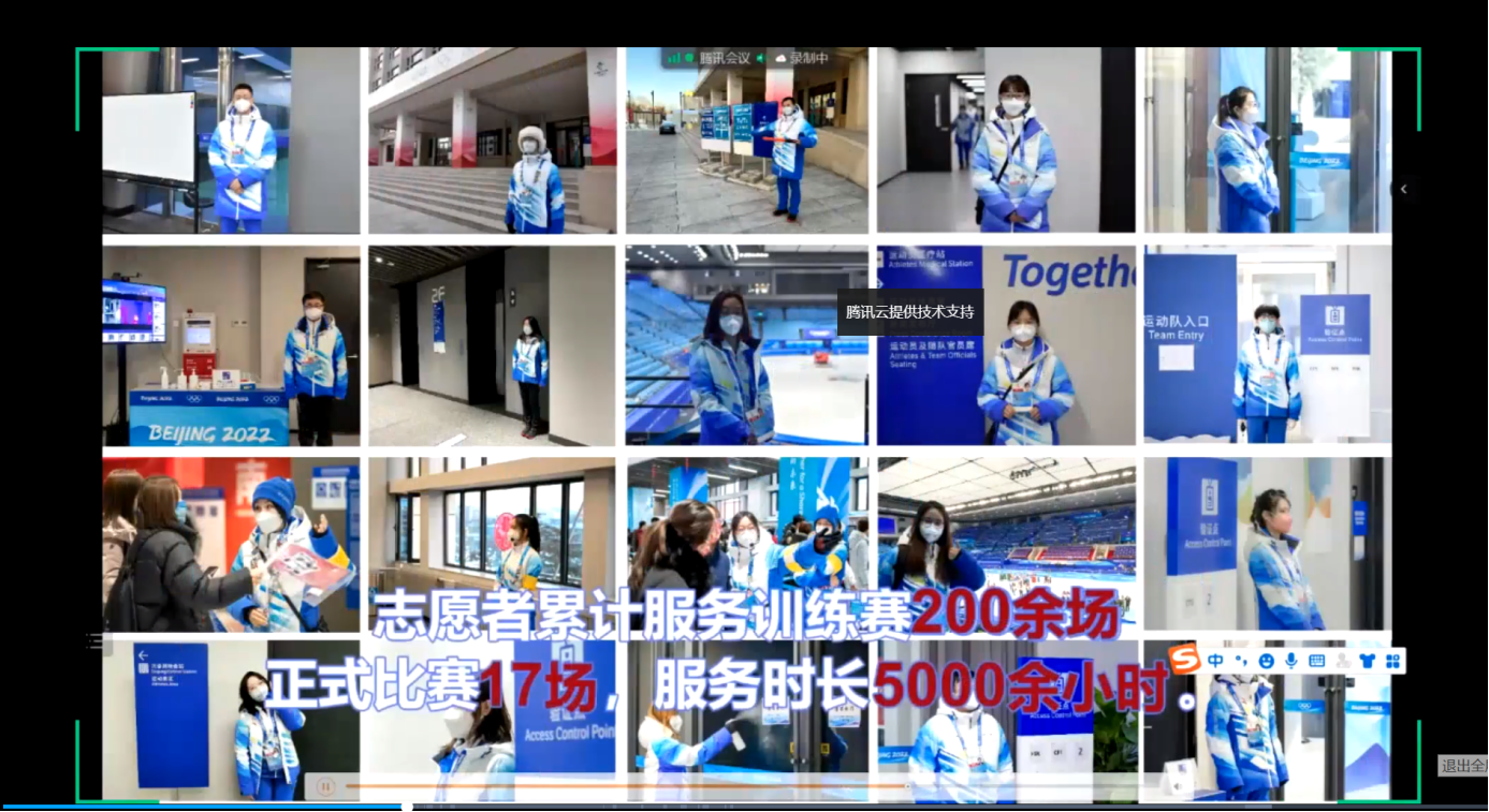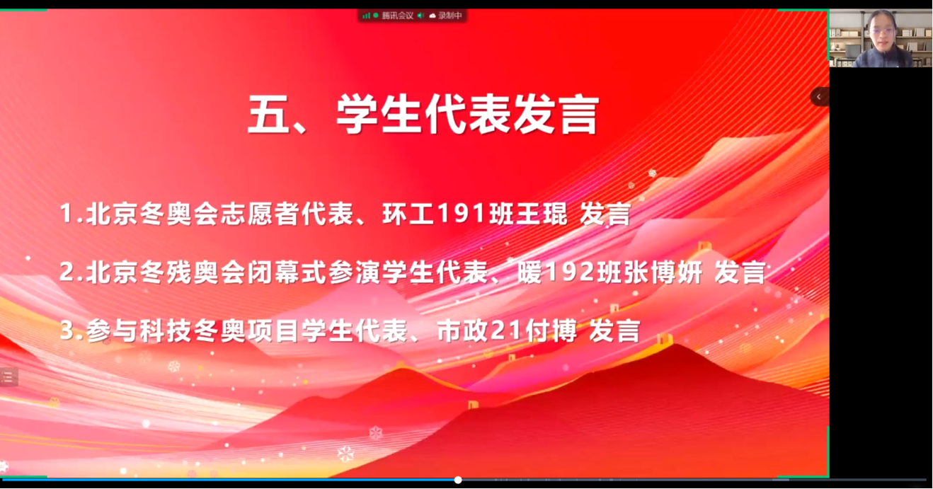 科技冬奥项目教师代表郝学军教授从项目开展背景、实施过程、技术创新等方面,介绍了临时结构低碳供热保温与通风关键技术和严寒环境下高性能临时建筑设施开发项目的基本情况。北京冬奥会志愿者代表、环工191班王琨、北京冬残奥会闭幕式参演学生代表、暖192班张博妍、参与科技冬奥项目学生代表、市政21付博三位同学分享了他们在志愿服务、参演参训环节和开展科技冬奥项目期间的感人故事和收获体会。