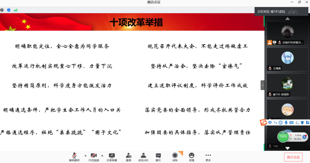会后,主要团学骨干发表学习心得,暖171孙巍同学表示:《若干意见》明确提出要明确学生会的职能定位,我们应该保持学生会的政治性、先进性、群众性,全心全意为同学服务。暖181孟钰同学表示:学生会是斗地主网页版