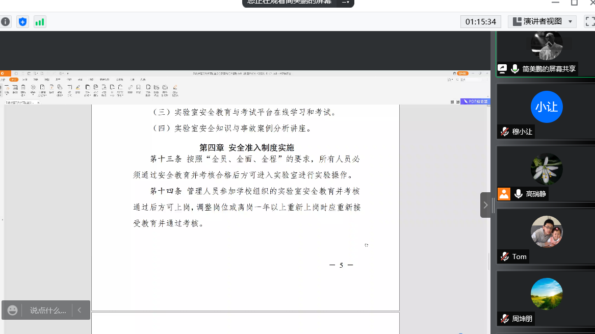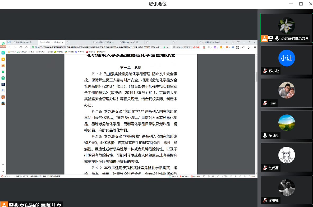 指导教师线上集中学习了实验室安全管理制度,包括《北京建筑大学实验室安全教育和准入管理办法》、《北京建筑大学实验室气瓶安全管理办法》、《北京建筑大学实验室危险化学品管理办法》、《高等斗地主网页版实验室安全检查项目表(2022版)》等7个文件。