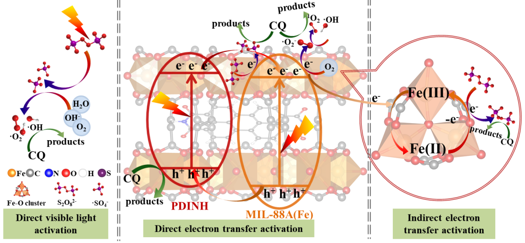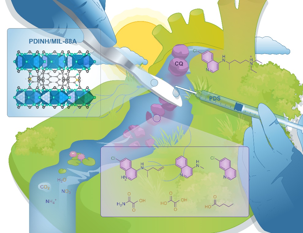 该工作报道了通过球磨法制备了有机半导体PDINH以及铁基金属-有机骨架MIL-88A(Fe)复合物,研究了其在LED可见光下催化活化过二硫酸盐(PDS)降解磷酸氯喹(CQ)的性能。此研究通过DFT计算明确了CQ的易受攻击活性位点,同时结合质谱数据分析明确了CQ的降解路径,并利用计算模型评价了CQ及其降解中间产物的毒性。证实了此复合物光催化活化PDS不仅可以去除CQ,而且可以降低CQ的毒性。